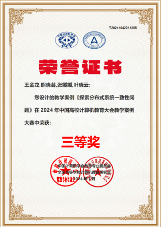 该项赛事由中国计算机学会、全国高等学校计算机教育研究会主办,自今年3月份启动以来收到来自全国高校的357项作品。经过专家网络初评和工作组现场评审,永利官网与包括清华大学、北京航空航天大学、国防科技大学等在内共计71篇优秀案例入围决赛。在决赛答辩现场,叶晓云、熊晓芸两位教师介绍了所提交案例《探索分布式系统一致性问题》的设计目的、内容及其在教学中的应用,顺利通过答辩并获得评委专家的一致认可,最终荣获全国三等奖。