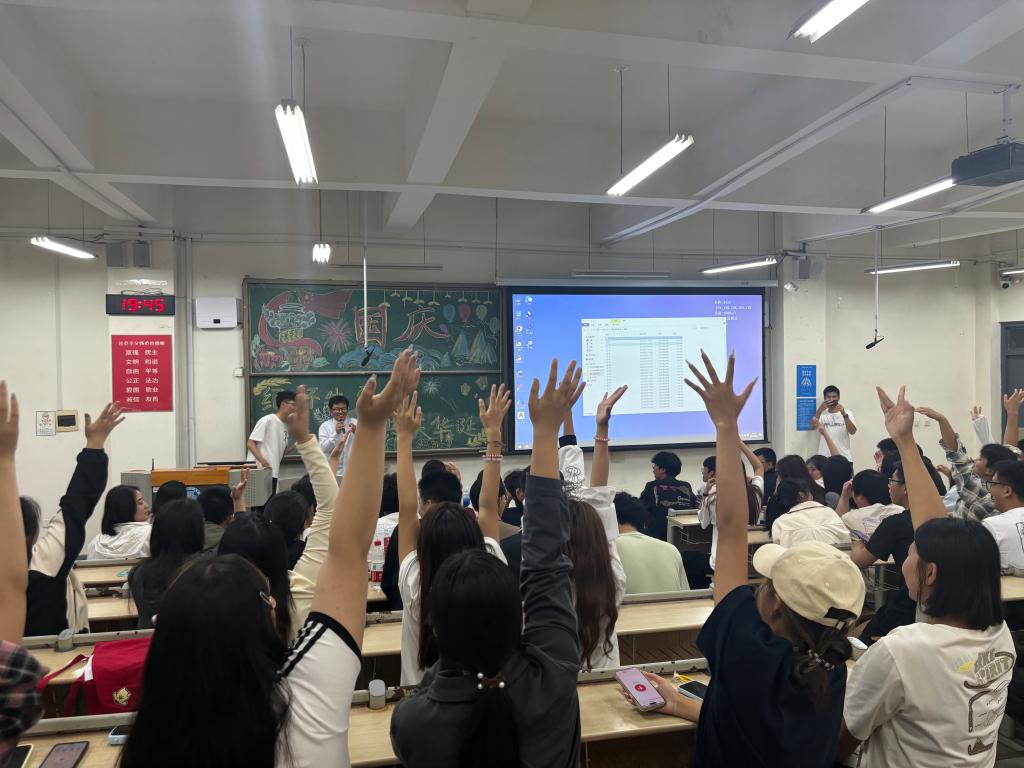 9月28日,理学院举办“‘创’承先烈志,‘新’迎国庆彩”知识竞答活动。活动中同学们分组竞技,通过知识问答、听歌识曲、观影鉴赏等形式,再次共同回顾革命历史,感悟先烈们的英勇事迹。现场气氛热烈而又温馨,抢答声此起彼伏,展现了同学们对革命文化的浓厚兴趣,活动结束后不少同学津津乐道、意犹未尽。“观影鉴赏环节中,当看到影视作品中国旗飘起来的时候就很想哭,被那种爱国情怀深深震撼了。”力学231班李想表示。