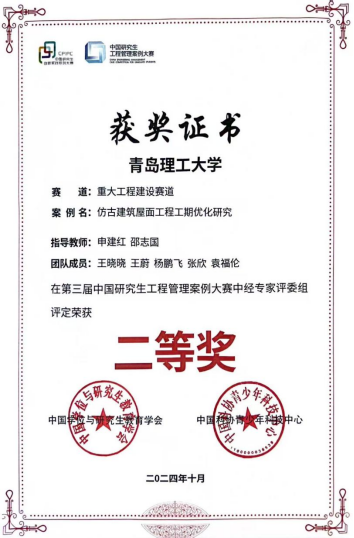 本届比赛分为重大工程建设赛道、重大系统研发赛道、精益生产赛道等6大赛道,经过专家评审、全国总决赛的多轮选拔,由管理工程学院申建红、邵志国老师指导,MEM研究生王晓晓、王蔚、张欣、杨鹏飞、袁福伦组成的“青鲤工管”团队的参赛案例《仿古建筑屋面工程工期优化研究》在187家研究生培养单位提交的572个案例中脱颖而出,荣获“重大工程建设”赛道第五名、全国二等奖。