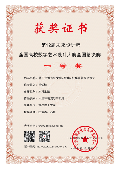 未来设计师·全国高校数字艺术设计大赛(NCDA)是入选《全国普通高校学科竞赛排行榜》,多家教育厅认定,“学习强国”学习平台支持,对接联合国国际赛的全国性大学生竞赛。本届大赛共有1,891所高校参赛,共征集298,763件作品,设立29个省级赛区。艺术与设计学院师生参赛团队先后经过校赛、省赛、全国总决赛等多个环节的激烈角逐,最终学院10支参赛队伍脱颖而出,荣获国家级奖项。
