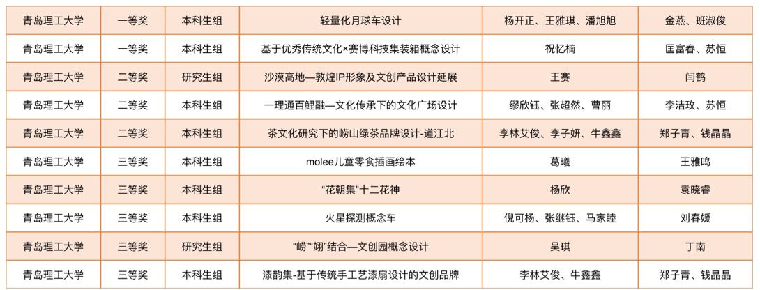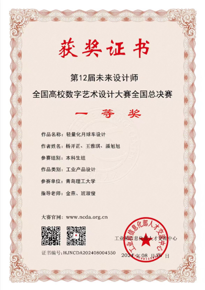 杨开正、王雅琪、潘旭旭团队的参赛作品《轻量化月球车设计》(指导老师:金燕、班淑俊)和祝忆楠的参赛作品《基于优秀传统文化×赛博科技集装箱概念设计》(指导老师:匡富春、苏恒)荣获全国一等奖。此外,另有8支团队分别荣获国家级二等奖和国家级三等奖。这些奖项的获得,不仅彰显了艺术设计学院师生的专业水平,也体现了学院在培养具有创新思维和实践能力人才方面的显著成效。