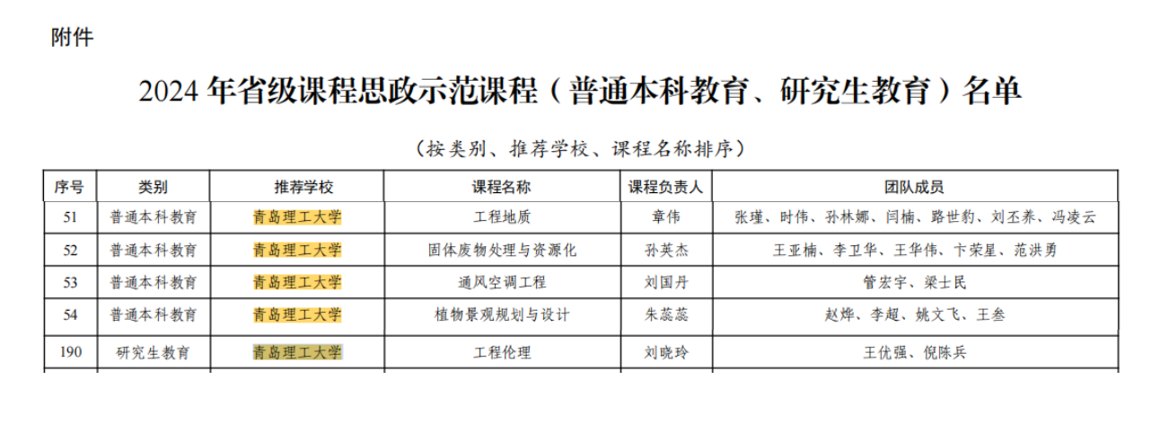 2024年11月,学校根据《山东省高等学校课程思政研究中心关于开展2024年省级课程思政示范课程(普通本科教育、研究生教育)建设工作的通知》要求,分别由教务处、研究生院牵头,广泛动员、精心组织,经过前期动员申报、资格审核与专家评审,进行省级课程思政示范课程申报推荐,最终获批5门山东省普通高等教育课程思政示范课程:章伟的《工程地质》、孙英杰的《固体废物处理与资源化》、刘国丹的《通风空调工程》、朱蕊蕊的《植物景观规划与设计》、刘晓玲的《工程伦理》。