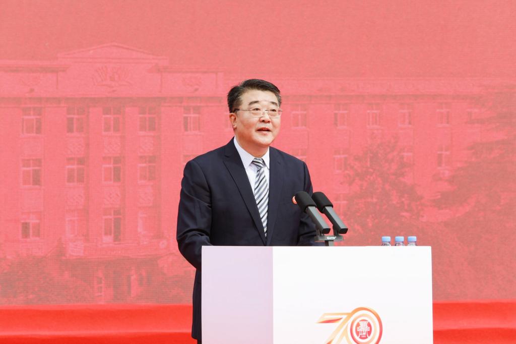 山东省人民政府参事王安德作为校友代表致辞。他向母校师长的教育培养表示真挚的感谢,为母校发展取得的成绩感到由衷的自豪。他表示,广大校友将相互勉励、相互支持,顽强拼搏、开拓进取,以优异成绩报答母校。同时,衷心祝愿母校以七十周年校庆为新的起点,在传承光荣历史和办学经验的同时,与时俱进,开拓创新,乘风破浪,再创新辉煌!