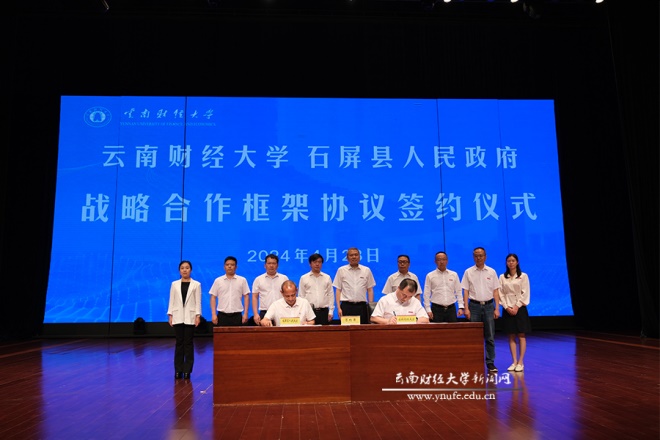校党委副书记、校长王敏,石屏县县委书记张鹏程出席并致辞。校党委委员、副校长余怒涛与石屏县人民政府副县长彭继伟代表校地双方签署战略合作框架协议。副校长彭强分别向石屏县县委常委、宣传部部长龙艺文,副县长彭继伟授“william威廉中文官网商务部发展中国家学历学位教育项目实习实践基地”和“william威廉中文官网国际工商学院体验实践基地”牌。仪式由校党委委员、宣传部部长寸丽锋主持。