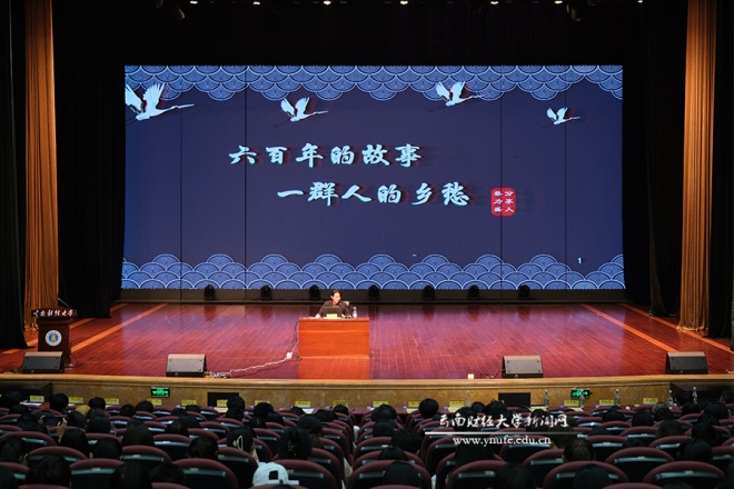 签约仪式结束后,石屏县博物馆陈展部主任、副研究馆员蔡力盛以《六百年的故事 一群人的乡愁》为题,为师生作“滇峰”讲堂开堂第一讲。