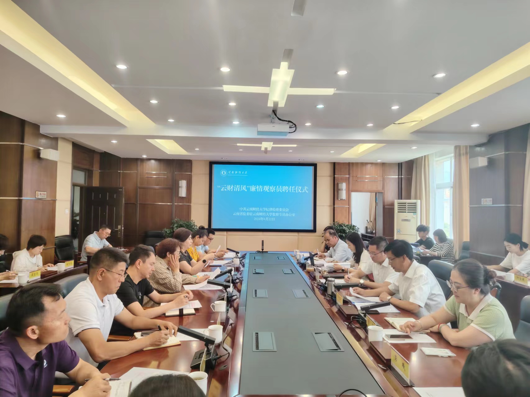 第一阶段是聘任仪式。由校纪委副书记谢维华宣读《关于聘任“云财清风”廉情观察员聘任通知》,校纪委书记、监察专员业光远,两位纪委副书记为22名廉情观察员颁发了聘书并合影留念。