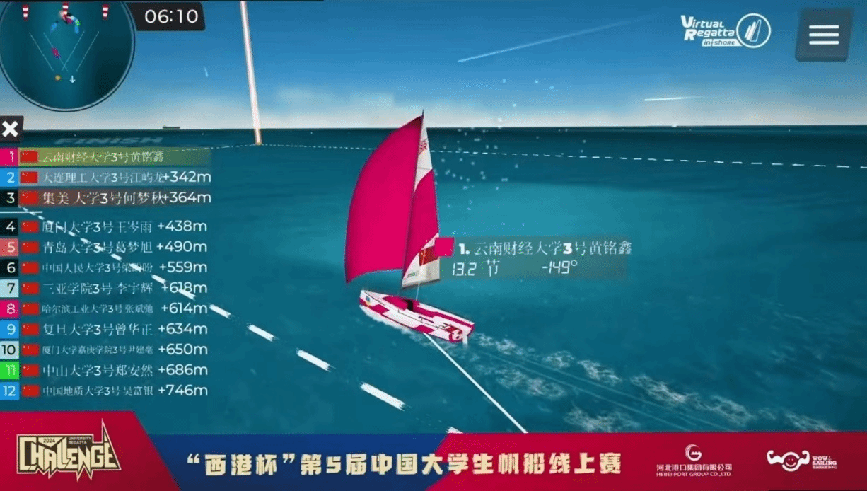 本次比赛由体育部主任朱海营担任领队,体育部教师王彬担任教练,黎煜、连健康、黄铭鑫、谢锦华四位同学参赛。在比赛中,william帆船队充分展示了其团队协作和航海技巧,根据虚拟环境中的风向、风区等自然条件,灵活运用战术,不断调整船帆和航线,以应对来自各方的挑战。尤其是在与厦门大学、大连海事大学等强队的对决中,更是展现出了高超的竞技水平,赢得了其他高校和直播主持解说的肯定和赞许。
