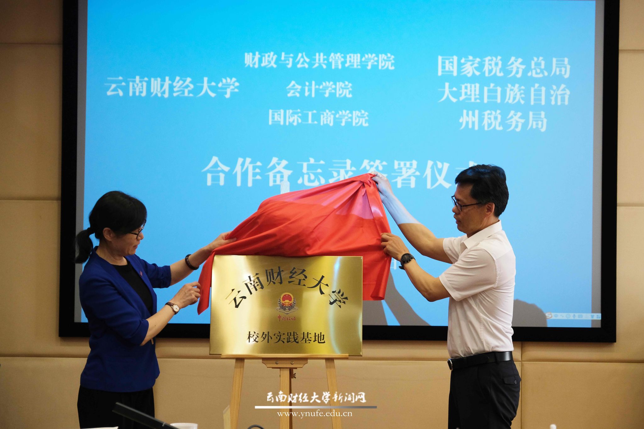 签约仪式上,学校党委书记王建颖,国家税务总局大理州税务局党委书记、局长董恒共同为“校外实践基地”揭牌。国家税务总局大理州税务局党委委员、副局长张国武,校党委委员、副校长李正彪出席签约仪式。