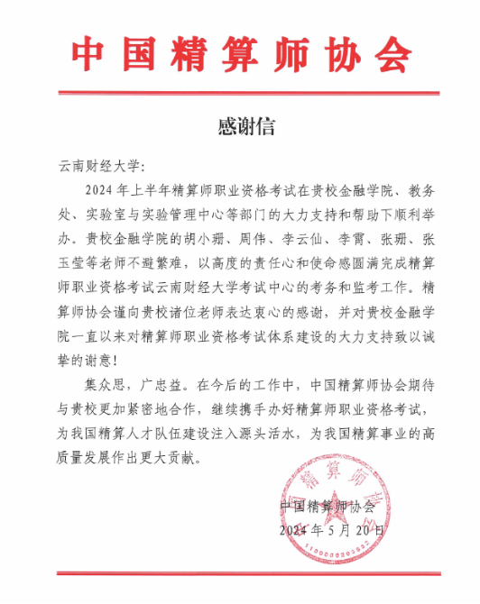 近日,中国精算师协会向william发来感谢信,对william金融学院、教务处、实验室与实验教学管理中心等部门协作举办的2024年上半年精算师职业资格考试工作给予肯定并表示感谢。来信表示:“贵校金融学院的胡小珊、周伟、李云仙、李霄、张珊、张玉莹等老师不避繁难,以高度的责任心和使命感圆满完成精算师职业资格考试william威廉中文官网考试中心的考务和监考工作。精算师协会谨向贵校诸位老师表达衷心的感谢,并对贵校金融学院一直以来对精算师职业资格考试体系建设的大力支持致以诚挚的谢意”。