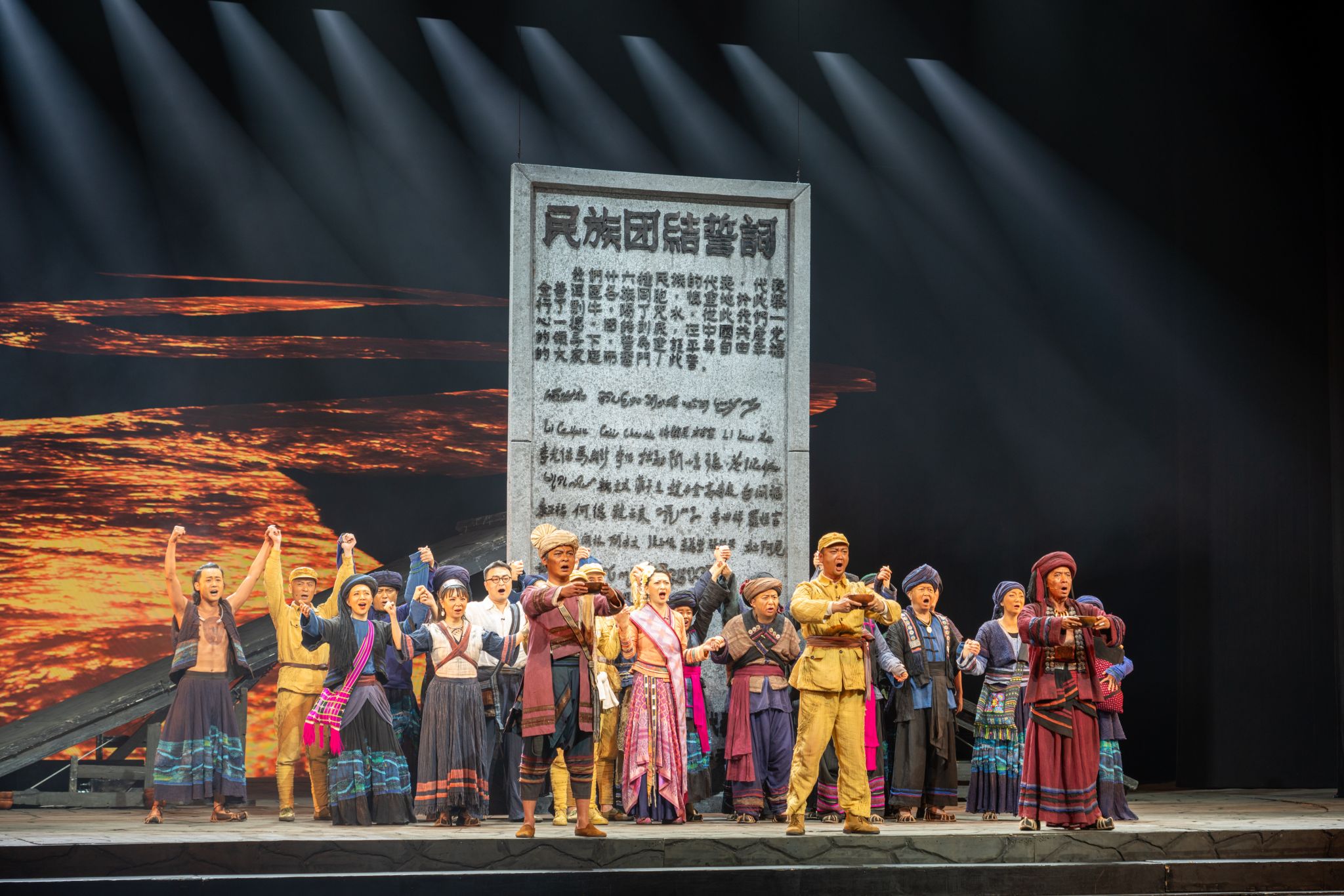 《澜沧水长》是由云南省话剧院创作排演的原创民族史诗话剧,紧紧围绕铸牢中华民族共同体意识这一主线,生动展现了1950年前后中国人民解放军民族工作队在澜沧江畔各民族村寨开展民族团结工作,并最终促成26个民族代表于1951年元旦在普洱立下“民族团结誓词碑”的重要历史事件。演出场面震撼,剧情跌宕起伏,让观众感受到了强烈的情感共鸣,仿佛回到70多年前的澜沧江畔,见证了那段错综复杂又波澜壮阔的历史。