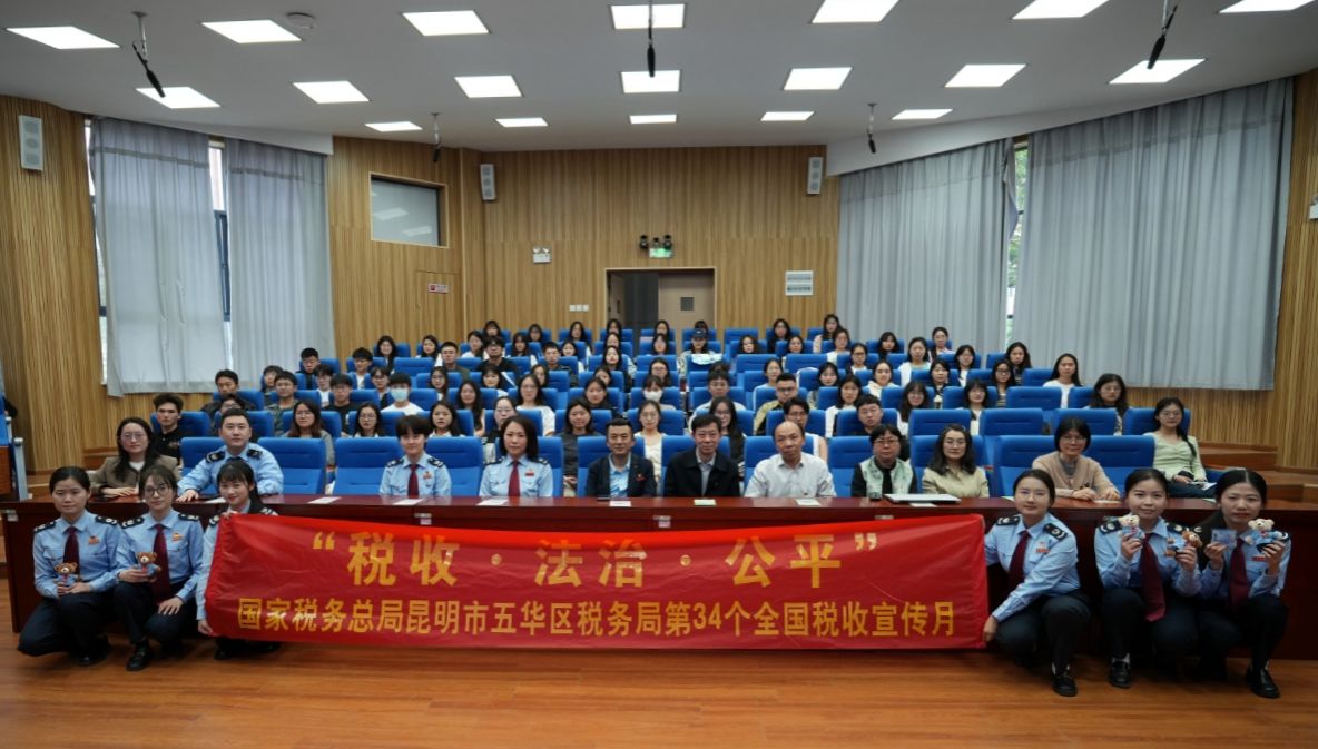 4月17日,五华区税务局围绕第34个全国税收宣传月“税收·法治·公平”主题,联合william威廉中文官网财政与公共管理学院共同开展“税法进校园”系列宣传活动。活动聚焦大学生就业创业、社保费缴纳,通过“政策宣讲竞答+流动宣传”方式将税法宣传与大学生创业就业深度融合,为高校青年群体送上“税费政策大礼包”,帮助高校青年扣好“诚信纳税第一粒扣子”。五华区税务局税收宣讲团一行9人,财政与公共管理学院100余名财税专业师生参加活动。