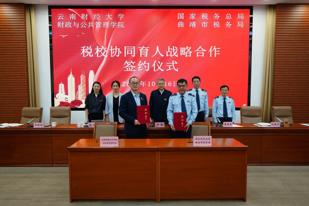 缪小林介绍了学院的基本情况,表示将通过此次签约打通高校课堂与税务实践通道,推动教学、实践、科研一体化,培养适应新时代税收事业发展的高素质复合型税务人才。财政与公共管理学院党委书记王晓芬介绍了学院党建工作情况,希望未来与曲靖市税务局深化组织共建、活动共办、人才共育、成果共享,打造税校党建联建示范样板。