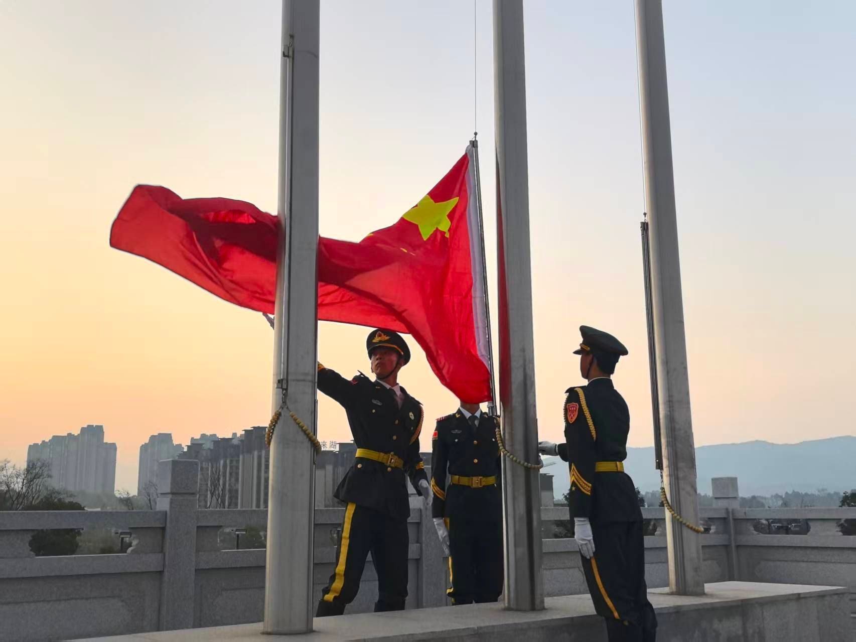 清晨,各校区的升旗仪式现场庄重肃穆。学校强军社国旗护卫队队员迈着铿锵有力的步伐,护送五星红旗走向升旗台。伴随着雄壮激昂的《义勇军进行曲》,鲜艳的五星红旗冉冉升起,全体师生肃立注目、高唱国歌,以赤诚之心向祖国致敬。来自财政与公共管理学院、经济学院、旅游与酒店管理学院的学生代表分别进行献词,表达了坚定理想信念、锤炼过硬本领、勇担时代使命的青春誓言,展现出云财学子昂扬向上的精神风貌。