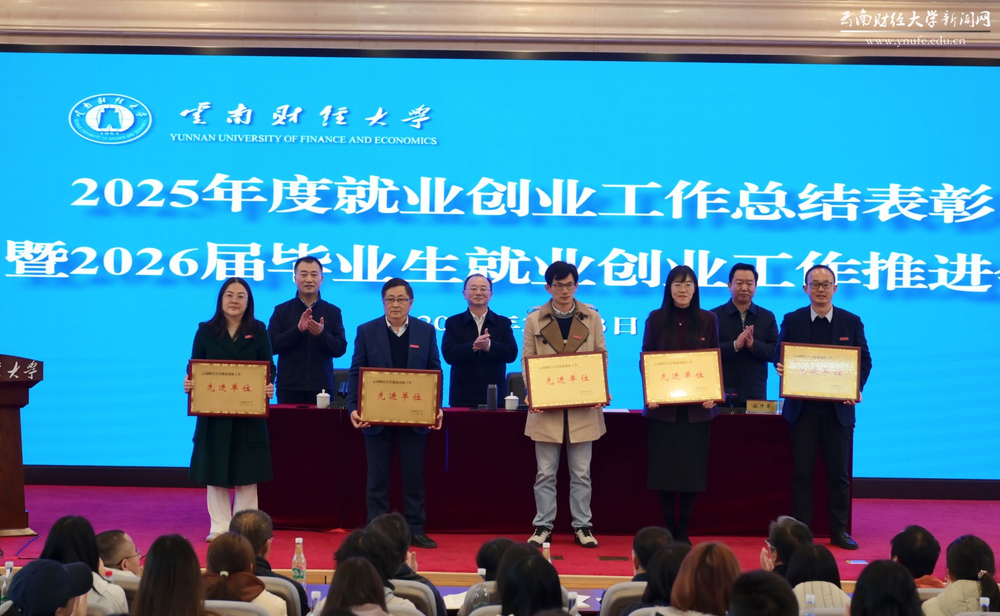 会上,校领导为2025年度就业创业工作先进单位和先进个人代表颁发奖牌和荣誉证书。金融学院党委书记胡小珊、财政与公共管理学院党委书记王晓芬分别就2025届毕业生就业工作举措作交流发言。