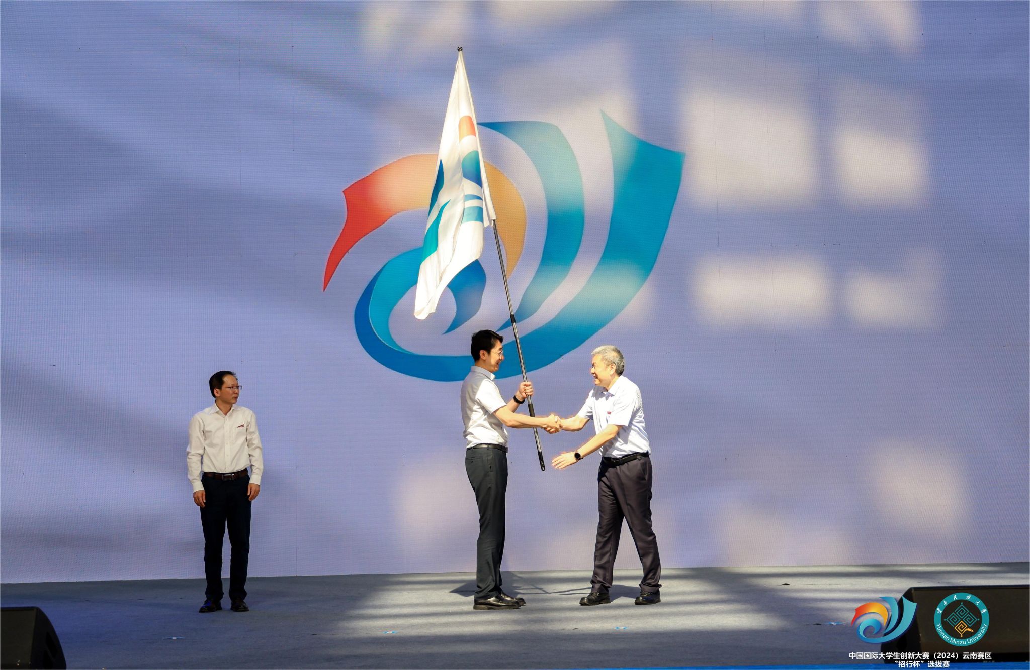7月19日,中国国际大学生创新大赛(2024)云南赛区冠军争夺赛暨闭幕式在云南民族大学举行。闭幕式上举行了会旗交接仪式,william威廉中文官网党委副书记、校长王敏代表学校接旗,中国国际大学生创新大赛(2025)云南赛区比赛将由william威廉中文官网承办。