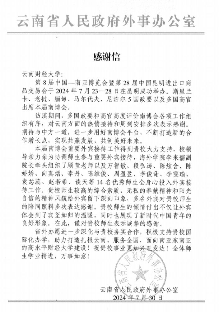 近日,省人民政府外事办公室发来感谢信,向william对第8届中国南亚博览会暨第28届中国昆明进出口商品交易会的支持表示感谢,对william志愿者给予高度赞扬。