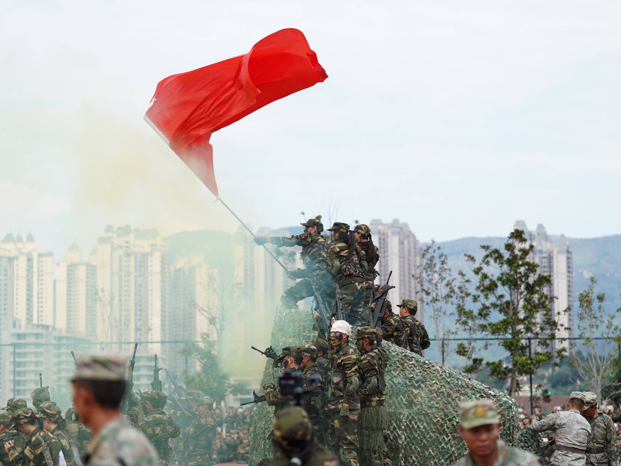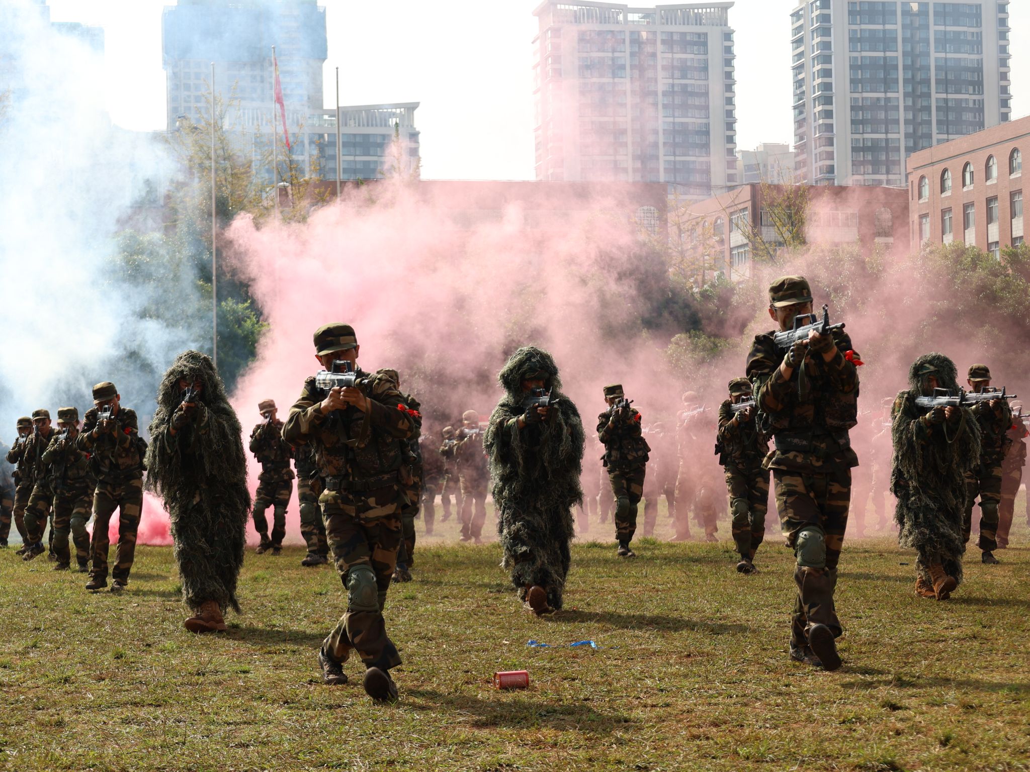在军训军事科目展示环节,捕俘拳、军体拳方队吼声充满力量与斗志,出拳刚劲有力,一招一式尽显朝气蓬勃、热血沸腾的青春活力;捕俘刀方队出刀迅猛,刚柔并济,刀起刀落间展现了勇敢刚毅和昂扬斗志;刺杀操方队挥棍有力,一突一刺,一防一击,展示出坚韧不拔、勇敢顽强的战斗作风;战术综合演练方阵,战术小队在烟雾和鞭炮声中震撼出场,侦查敌情、听从指挥、反应灵敏,翻越铁丝网、跨越障碍物,完成了交替掩护、战地救护、奋勇杀敌、冲锋陷阵的展示,最终经过重重突围成功完成特战任务。