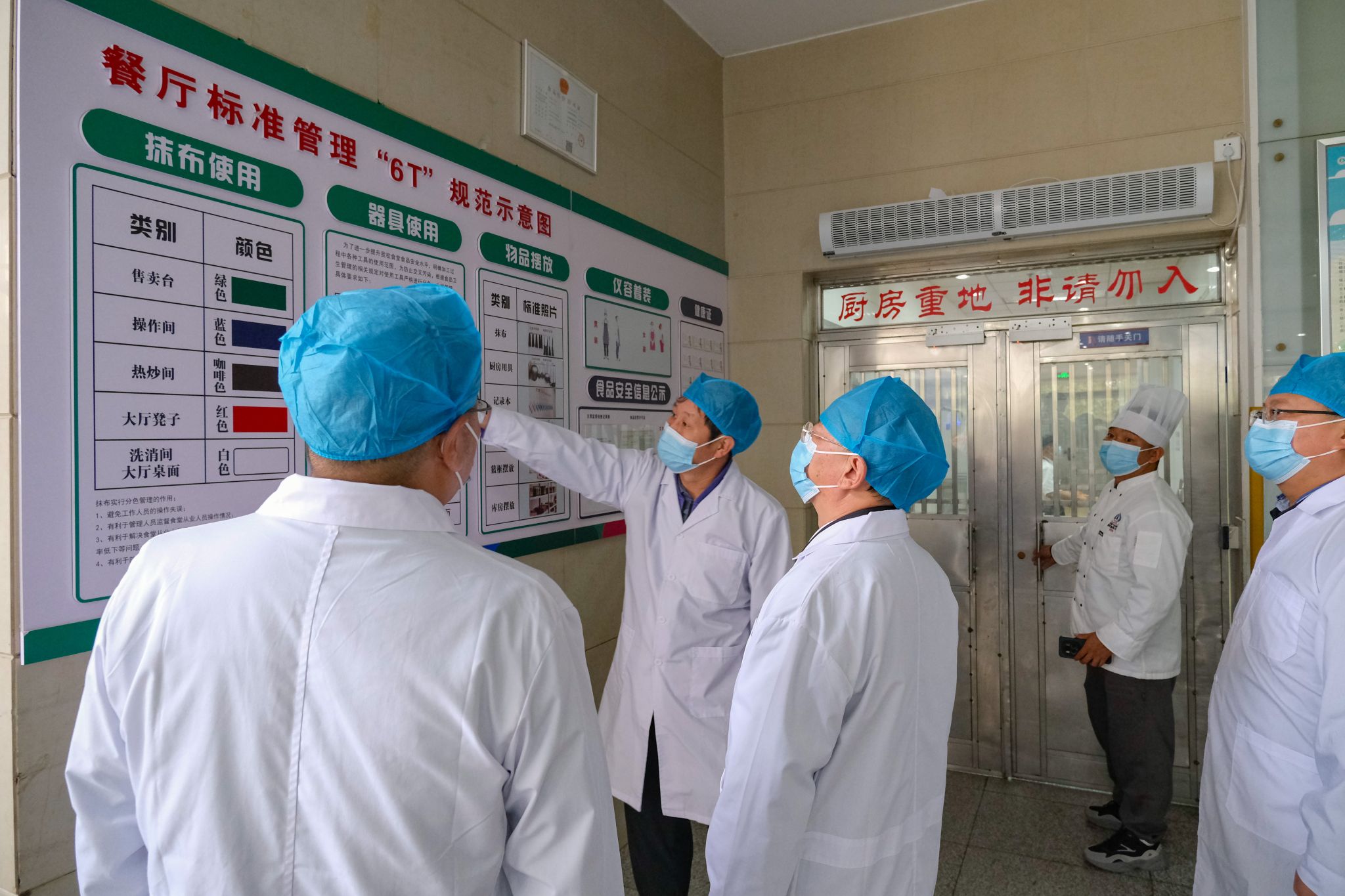 在海棠餐厅、英华餐厅各功能区,陈红一行先后到食堂仓库、初加工间、切配间、洗消间、冰箱间及售卖区检查食品安全工作落实情况。从原材料采购索证索票、进货查验、储存到加工制作、菜品留样、售卖等环节进行了全面细致的检查。