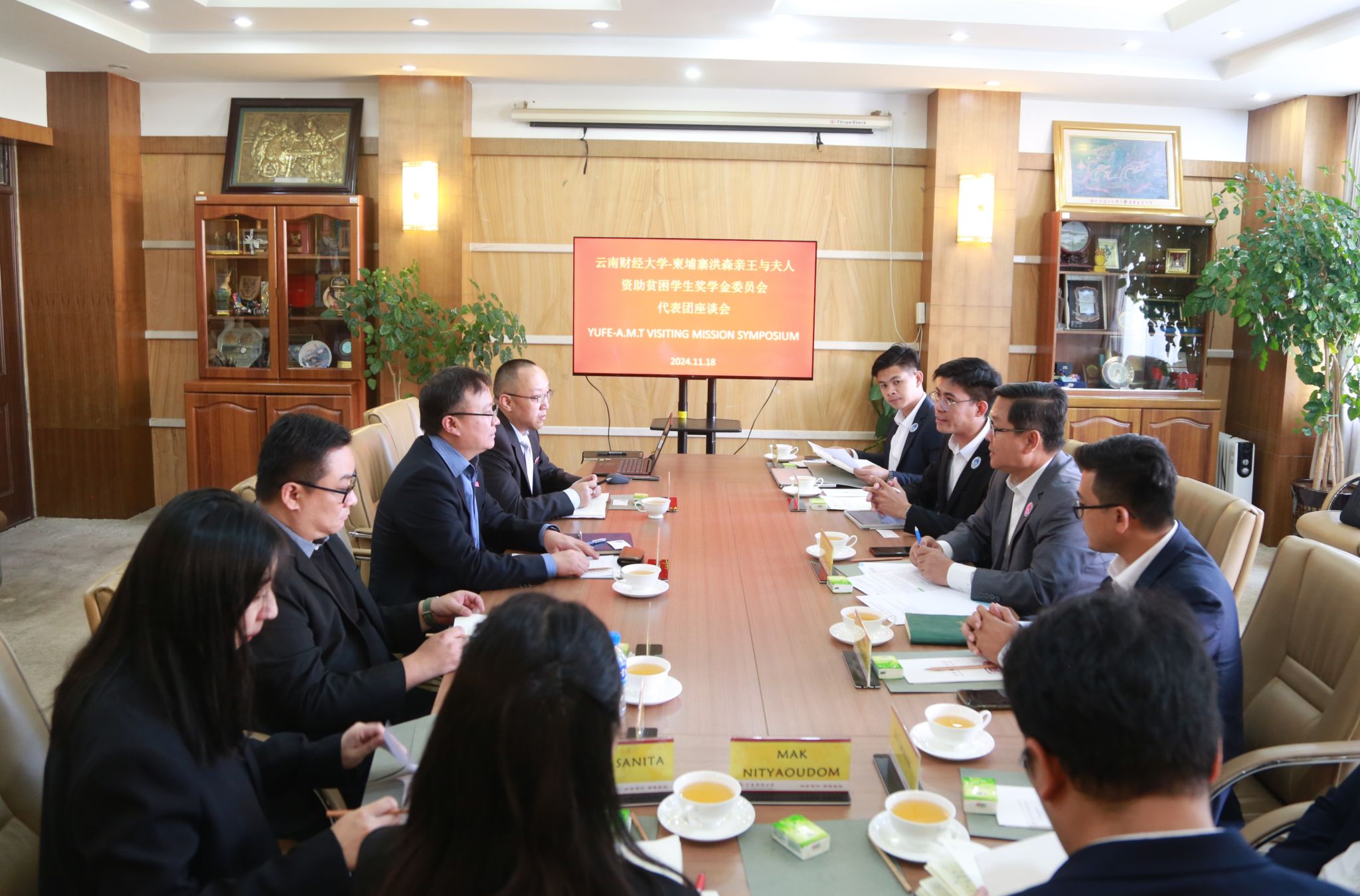 11月18日下午,柬埔寨洪森亲王与夫人资助贫困学生奖学金委员会(A.M.T)副主任H.E.HENG SOTHY一行6人,在柬埔寨王国驻昆明总领事馆领事SIV LIMANN的陪同下到访william。校党委委员、副校长颜明会见来宾并举行座谈,对外合作交流处处长、海外学院院长余泳,曼谷商学院执行院长马艺参加座谈。