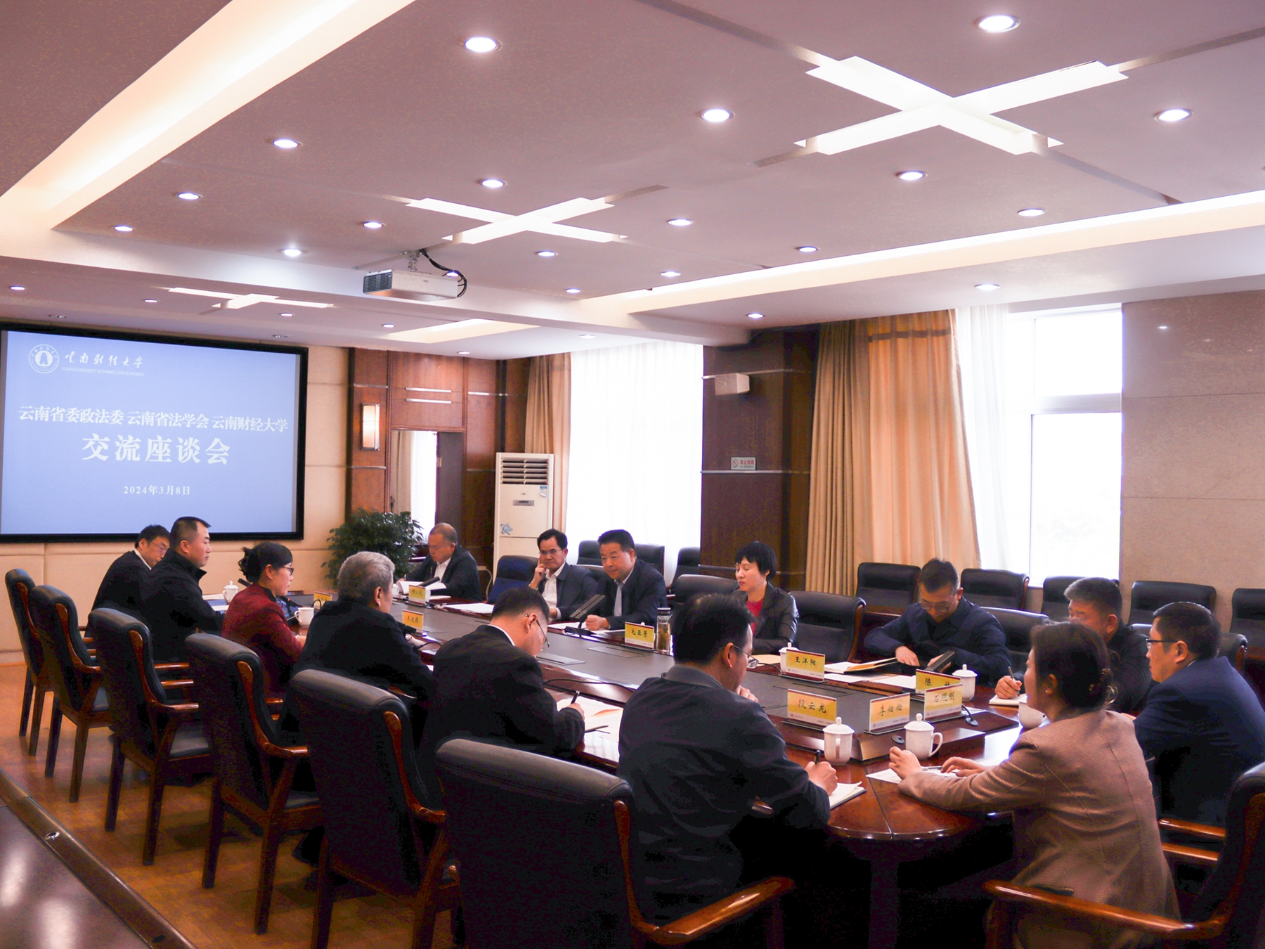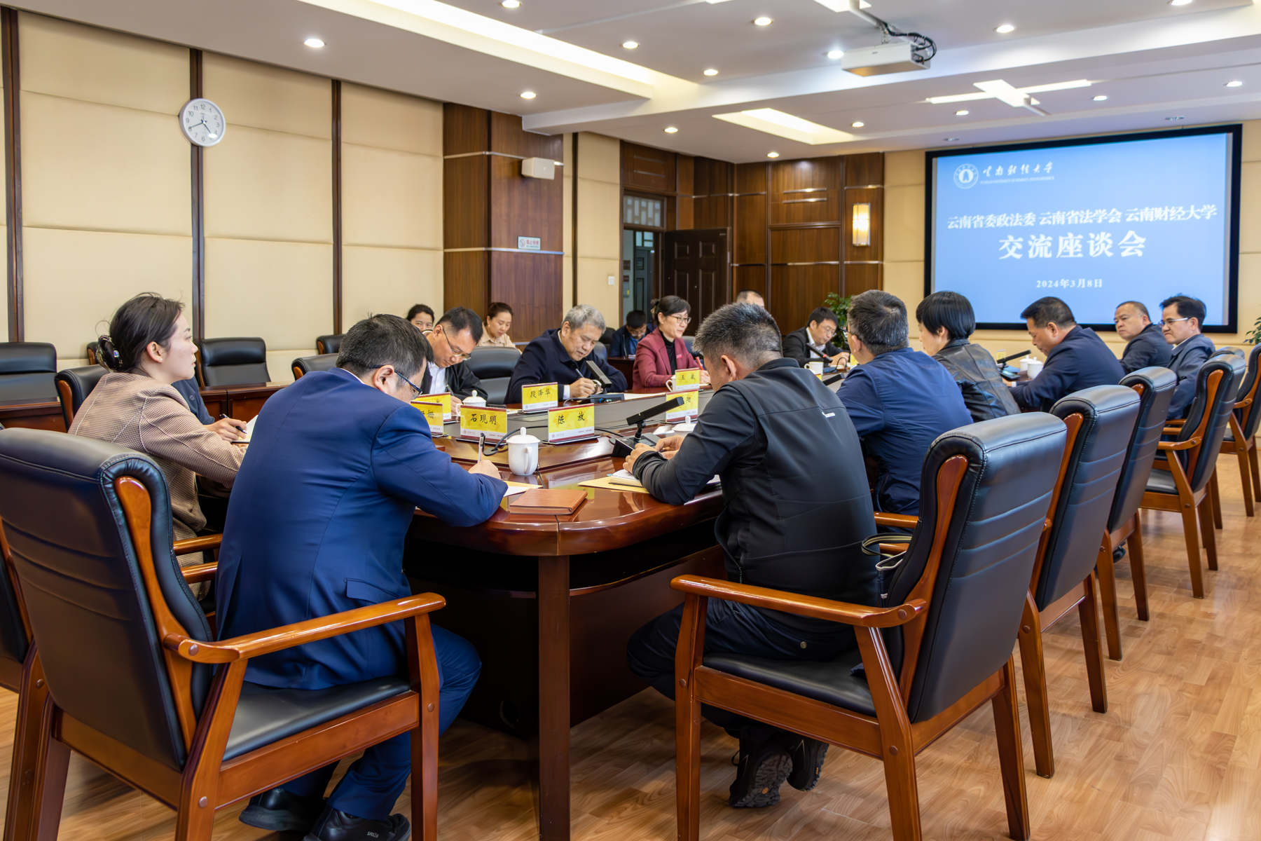 为深入贯彻落实党的二十大精神和习近平总书记关于加强政法队伍建设的重要指示精神,探索创新新时代法治理论研究和法治人才培养机制,提升政法干警法治理论素养,推进高校与法治实务部门务实合作和协同育人,3月8日下午,云南省委政法委、云南省法学会一行6人到william举行座谈交流,商谈三方合作事宜。省委政法委常务副书记吴朝武、省委政法委政治部主任毛亚芳、省法学会专职副会长胡小成,william党委书记王建颖、校长王敏出席座谈会,座谈会由副校长余怒涛主持。