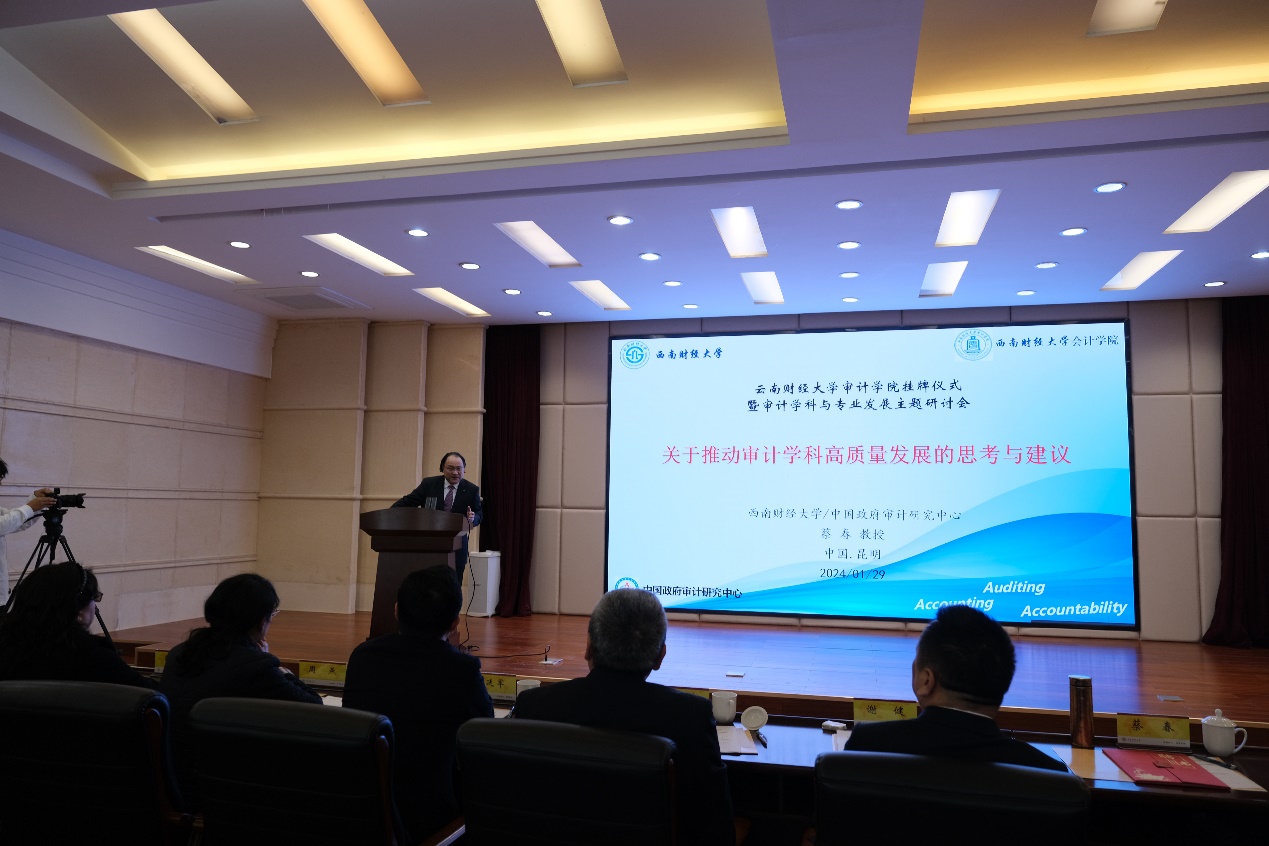 在主题演讲环节,谢健结合自己对二十届中央审计委员会第一次会议、2024年全国审计工作会议精神的理解,以及多年审计实践的工作体会,从微观和宏观两个层面分享了对于审计“理想王国”的理解和认识,同时阐述了审计学科建设对于实现审计“理想王国”的使命责任及助推作用。蔡春教授以“关于推动审计学科高质量发展的思考与建议”为主题,着重围绕学科内涵与学科建设、构建中国特色审计自主知识体系以及云财审计学科高质量发展的建议等三个方面,分享了自己从事审计研究近四十年的心得,为william威廉中文官网审计学科以及审计学院的创新发展提出意见建议。