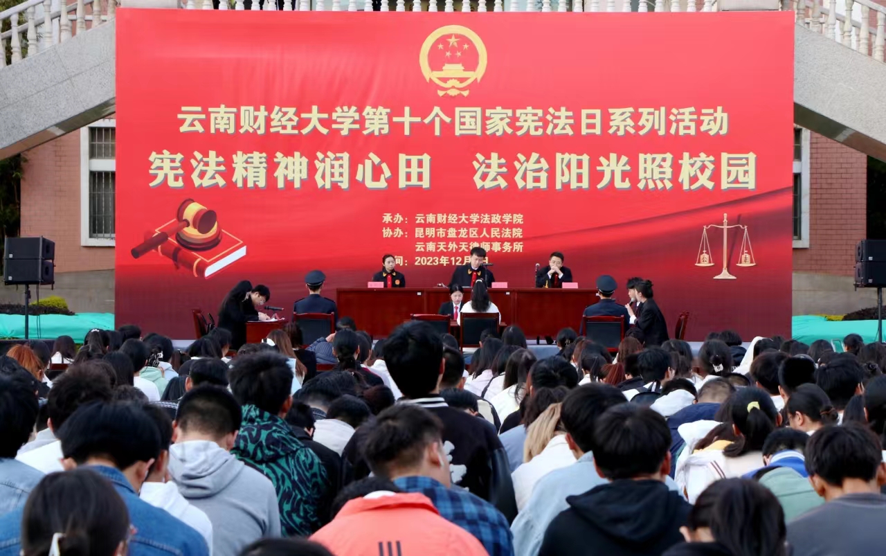 活动开展了刑事仿真法庭审判,由昆明市盘龙区人民法院法官组成刑事审判庭,云南天外天律师事务所律师、法政学院学生分别扮演公诉人和辩护人,以真实案例为基础进行。仿真法庭审判延续了“院所协同育人新实践,真实案件仿真诉讼进校园”活动,完整展示了法庭调查、被告人陈述、控辩双方举证质证、法庭辩论等真实庭审过程,实现了将普法从课堂搬到广场,让广大师生零距离观摩“庭审”现场的全过程,有效地普及了法律知识。