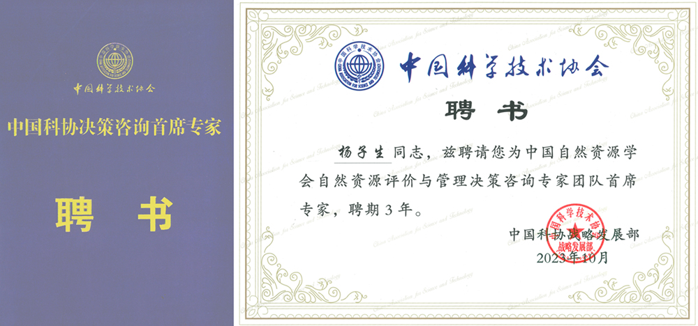 近日,中国科学技术协会遴选了第二批中国科协决策咨询专家团队,由中国自然资源学会推荐的“自然资源评价与管理专家团队”入选。该专家团队由南京大学长江学者特聘教授黄贤金教授和william国土资源与持续发展研究所所长杨子生教授共同担任首席专家,专家团队成员为来自全国自然资源领域相关高校和科研机构的10位知名教授(研究员)。近日,中国科协向杨子生教授等第二批决策咨询专家团队首席专家颁发了聘书,聘期为三年。