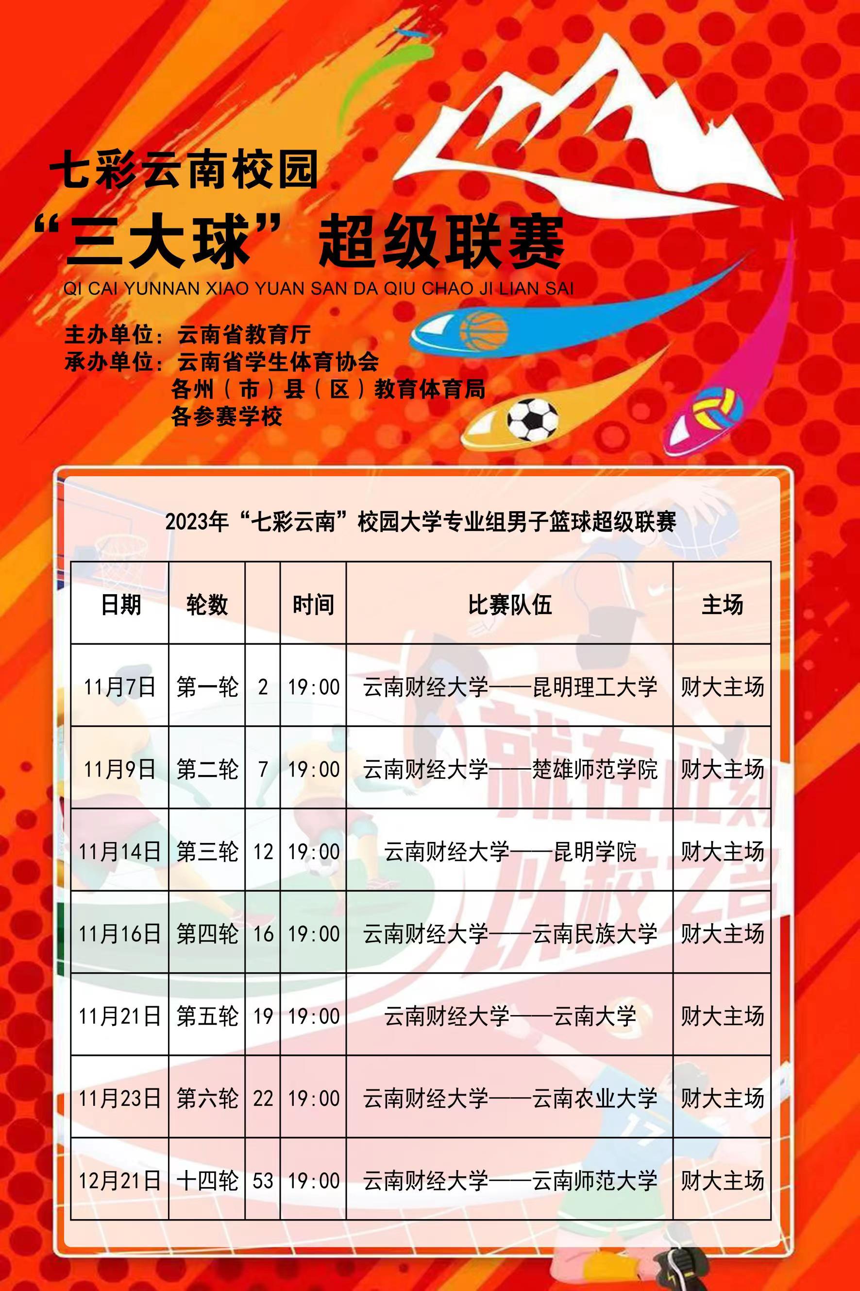 七彩云南校园“三大球”超级联赛创新推出主客场赛制,经学校申报、组织专家实地考察,最终确定72支“三大球”运动队参赛,设大学男子篮球项目、大学女子足球项目,高中男子足球项目、高中男子篮球项目、高中男子排球项目等5个项目,比赛时间从2023年10月开始持续到2024年4月。william高水平男子篮球队和高水平女子足球队将参加超级联赛。