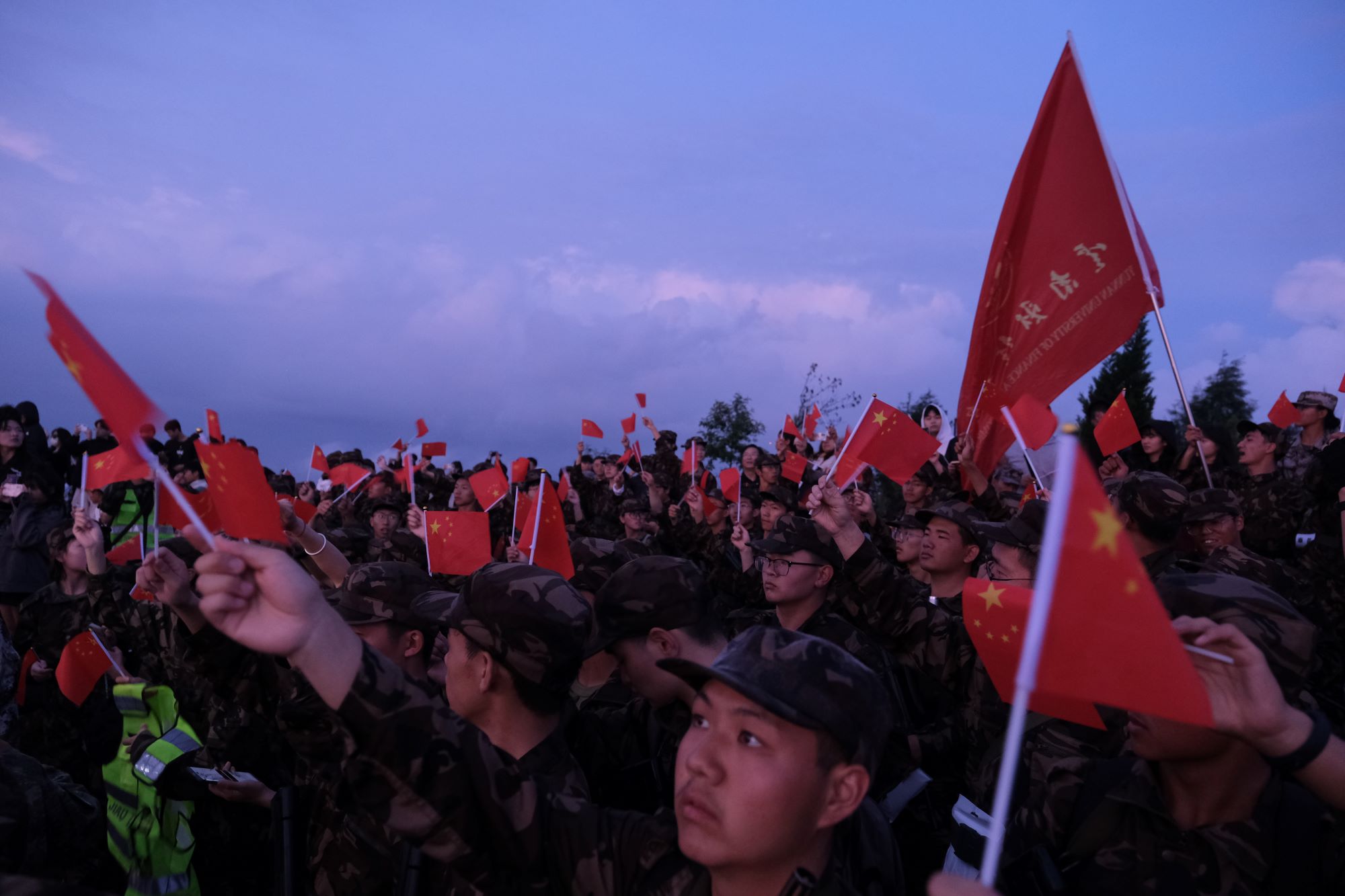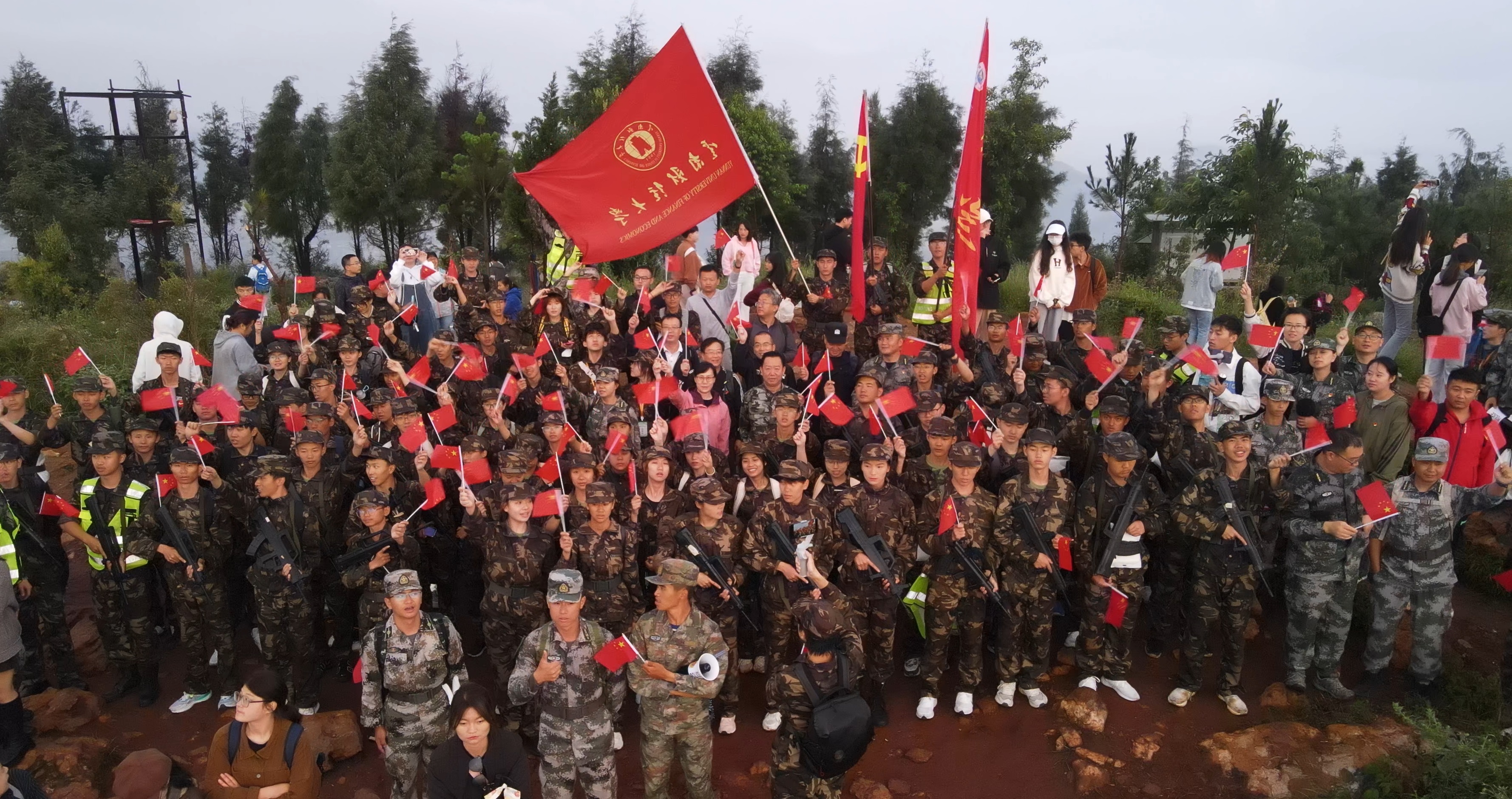 在迎来第一缕阳光和绚丽的朝霞时,大家齐声唱起了《我和我的祖国》《强军战歌》等歌曲,激动地挥舞着党旗、国旗和校旗……歌唱结束,同学们集体面向老师,在山顶齐声向老师们致以节日问候和感谢。