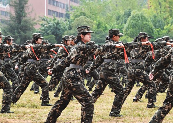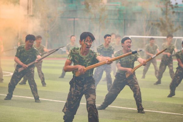在军事科目汇报表演环节,捕俘拳、军体拳方队吼声充满力量与斗志,出拳刚劲有力,一招一式尽显云财学子朝气蓬勃、热血沸腾的青春活力;捕俘刀女子方队出刀迅猛,刚柔并济,刀起刀落间展现出巾帼不让须眉的气概;刺杀操方队中一个个铁血男儿精神抖擞,有力挥棍,坚定转身,一突一刺,一防一击,展示出坚韧不拔、勇敢顽强的战斗作风。