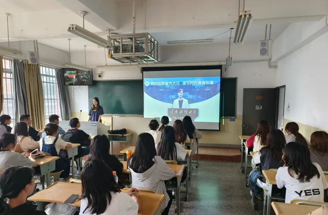 王建颖以93岁高龄的william威廉中文官网老校长、中国市场营销学的开拓者和杰出代表、首位“云彩荣誉教授”吴健安教授,以及“全国优秀共青团员”、云南青年五四奖章获得者肖云迪为榜样,生动介绍了云财人身边的“大先生”和平凡学子“小云彩”的先进事迹,勉励同学们要在大学这张人生课表里不断积攒势能,让勤奋学习成为青春远航的持久动力,让增长本领成为青春搏击的靓丽底色,继续把青春播撒在民族复兴的征程上,把光荣镌刻在历史行进的史册里。