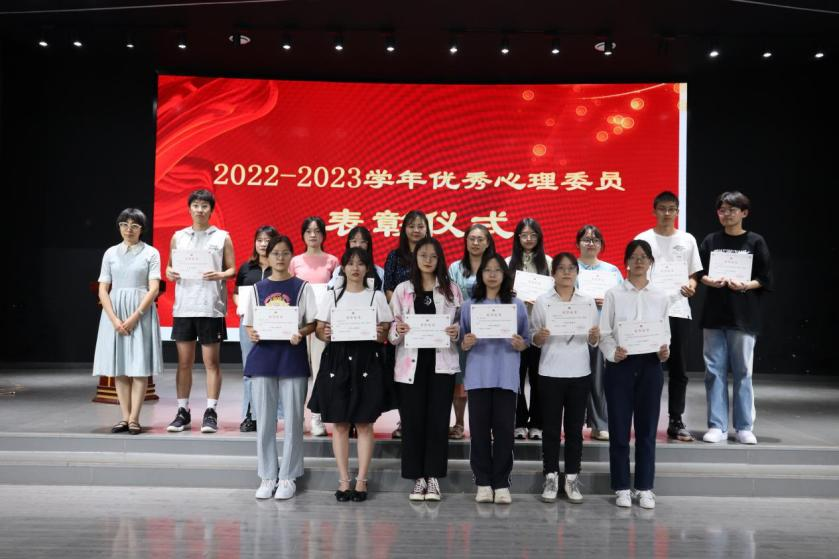陈瑜婕宣读2022-2023学年优秀心理委员表彰决定,102位同学获得2022-2023学年优秀心理委员称号。尹航、陈瑜婕和王瑞为14名优秀心理委员代表颁发奖状。