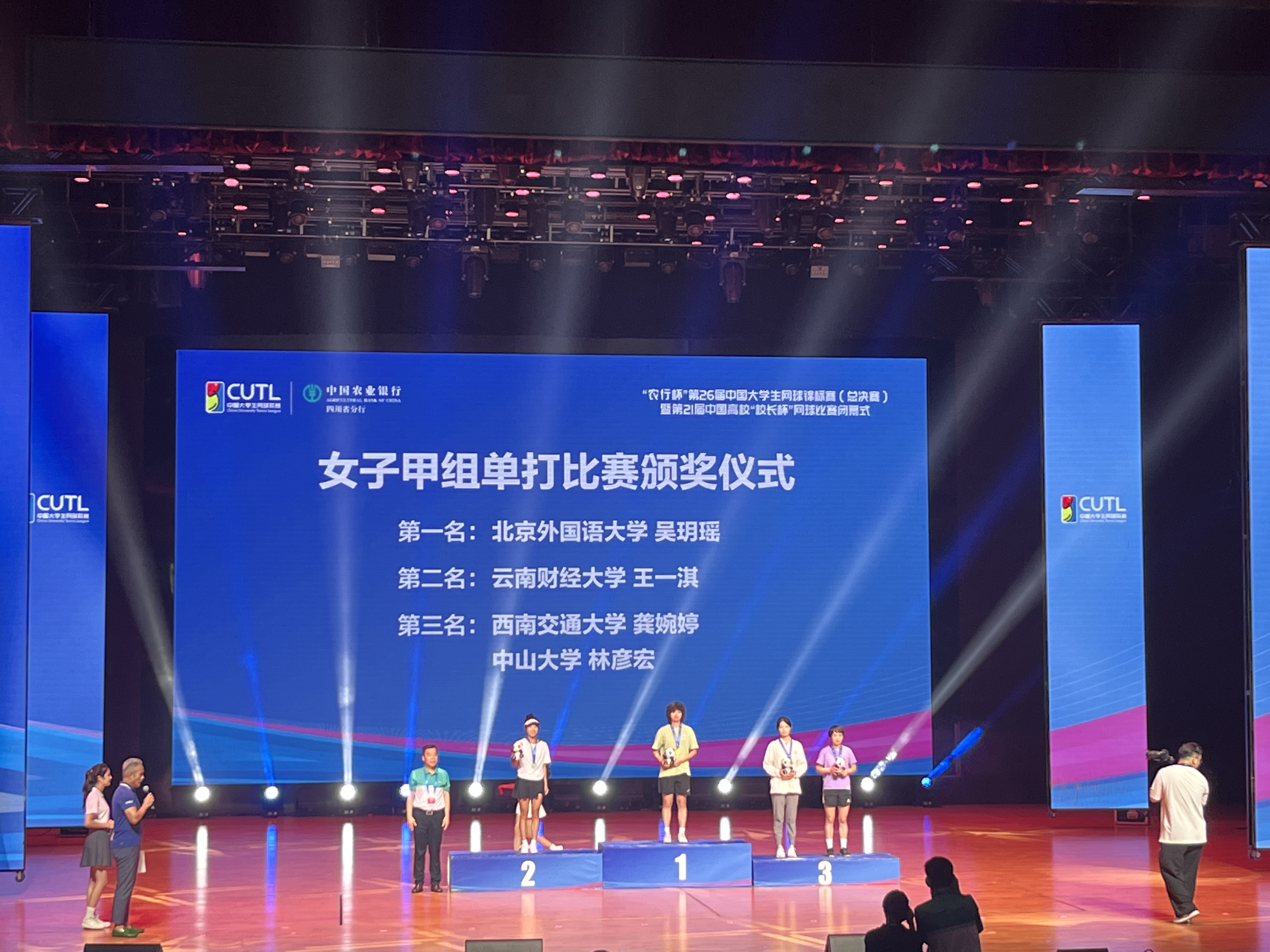 至此,william阳光组网球队最终以获得女子单打亚军,团体第5名的成绩结束了此次比赛,王一淇同学也被评为本届比赛“优秀运动员”。第26届大学生网球锦标赛全国总决赛共有110所高校的782名运动员参赛,经过7天,团体834场,单项634场比赛争夺,决出各项名次并圆满落幕。