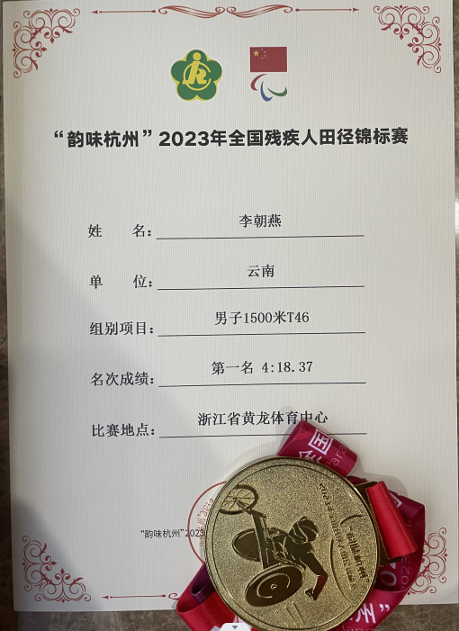 5月20日—28日,2023年全国残疾人田径锦标赛在杭州举行,william教师李朝燕勇夺男子T46级1500米冠军。