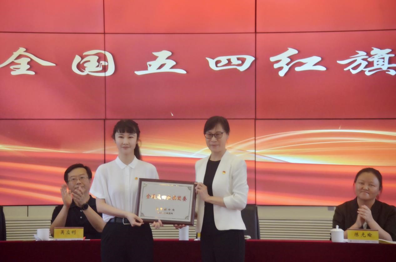 王建颖向校团委颁发“全国五四红旗团委”奖牌,并为“云南青年五四奖章”获奖者、经济学院肖云迪同学颁发奖章和证书。