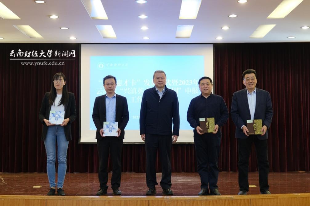 王敏代表学校向熊德平、明庆忠、姜茸、李亚波等4位人才代表颁发了“兴滇惠才卡”,对学校荣获“兴滇惠才卡”的所有专家学者提出三点希望:一是希望“兴滇英才”们深刻领会省委和学校党委“爱才敬才”的诚心,将获得“兴滇惠才卡”的荣誉转化为持续做好教学科研、人才培养的强大动力,努力创造更高水平、更高质量教学科研成果。二是希望“兴滇英才”全面贯彻落实学校“1186”战略任务,坚持崇高理想和良好道德情操,忠诚党的教育事业,做好师德师风表率;静心教书、潜心育人,教育学生成长成才,做好教书育人表率;以一流学科建设为目标,凝心聚气、团结协作,做好学科建设表率;以一流专业建设引领一流本科教育,着力推进专业建设提质增效,做好专业建设表率;坚持严谨的科学精神,坚守学术道德,带领团队专注学术科研,做好科学研究表率,充分发挥好生力军和领头雁示范带动作用,为建设高水平财经大学贡献更大的智慧和力量。三是希望全体“兴滇英才”扎根中国、深耕云南、干在云财。关于2023年云南省“兴滇英才支持计划”申报工作,王敏强调:全校上下要继续发扬和传承好云财重视人才、关心人才和支持人才的优良传统,齐心协力做好人才工作。王敏强调,各职能部门、教辅部门要切实提高政治站位,强化服务质量,提升人才服务保障水平,营造“爱才、留才、助才、用才”的良好氛围。各学院(科研院所)要牢固树立人才资源是第一资源的理念,要有容才的雅量和用才的智慧,把尊重和爱护人才体现在行动上、细微处,要深入贯彻落实好中央和省委人才工作精神,真正做到“想人才之所想,急人才之所急”,当好人才的“服务员”,切实为申报“兴滇英才支持计划”专家学者提供高质量服务保障,以确保学校2023年“兴滇英才支持计划”申报工作取得显著成效。