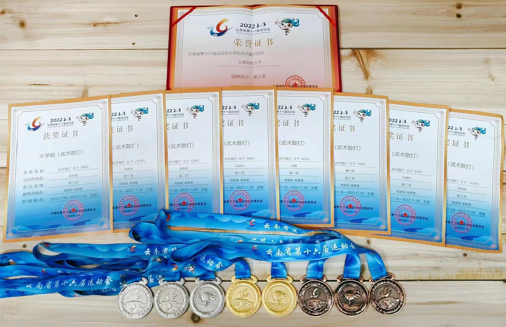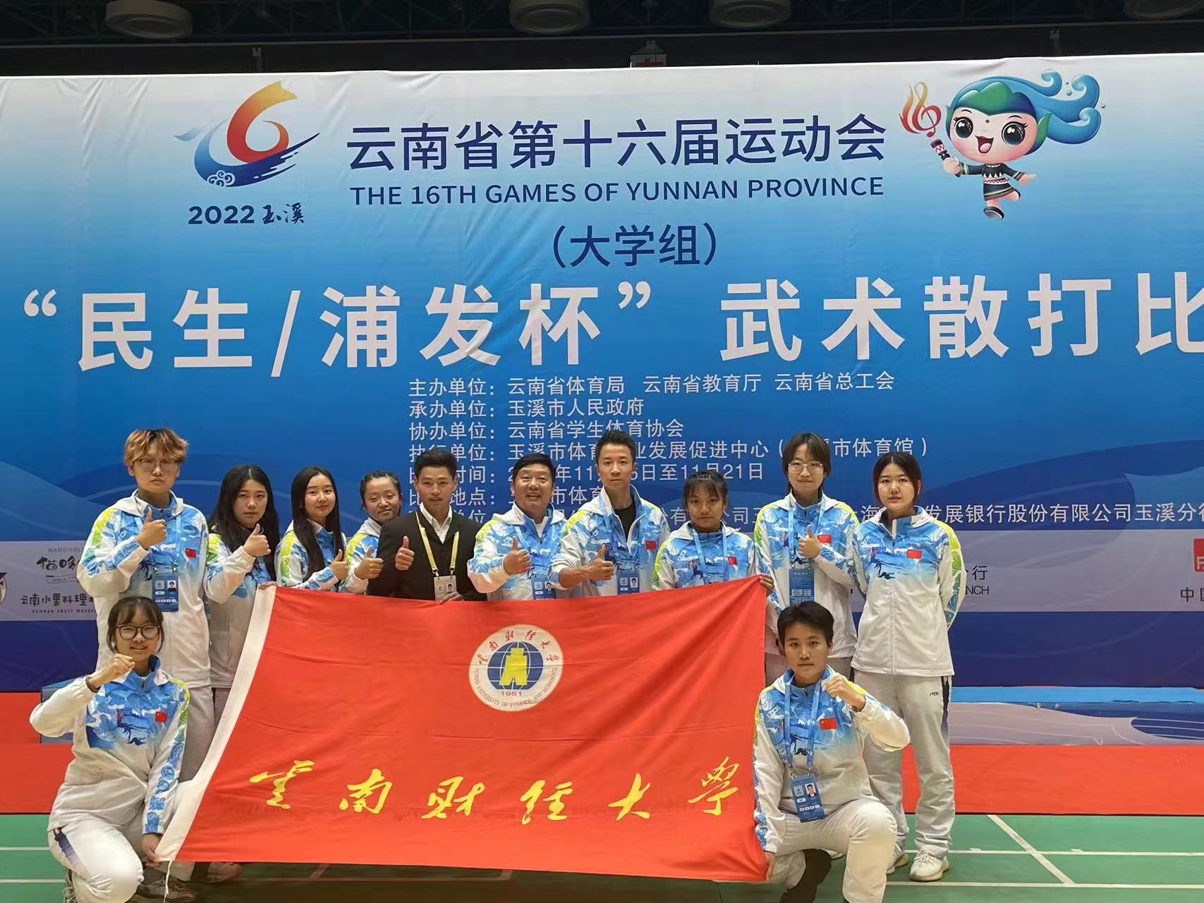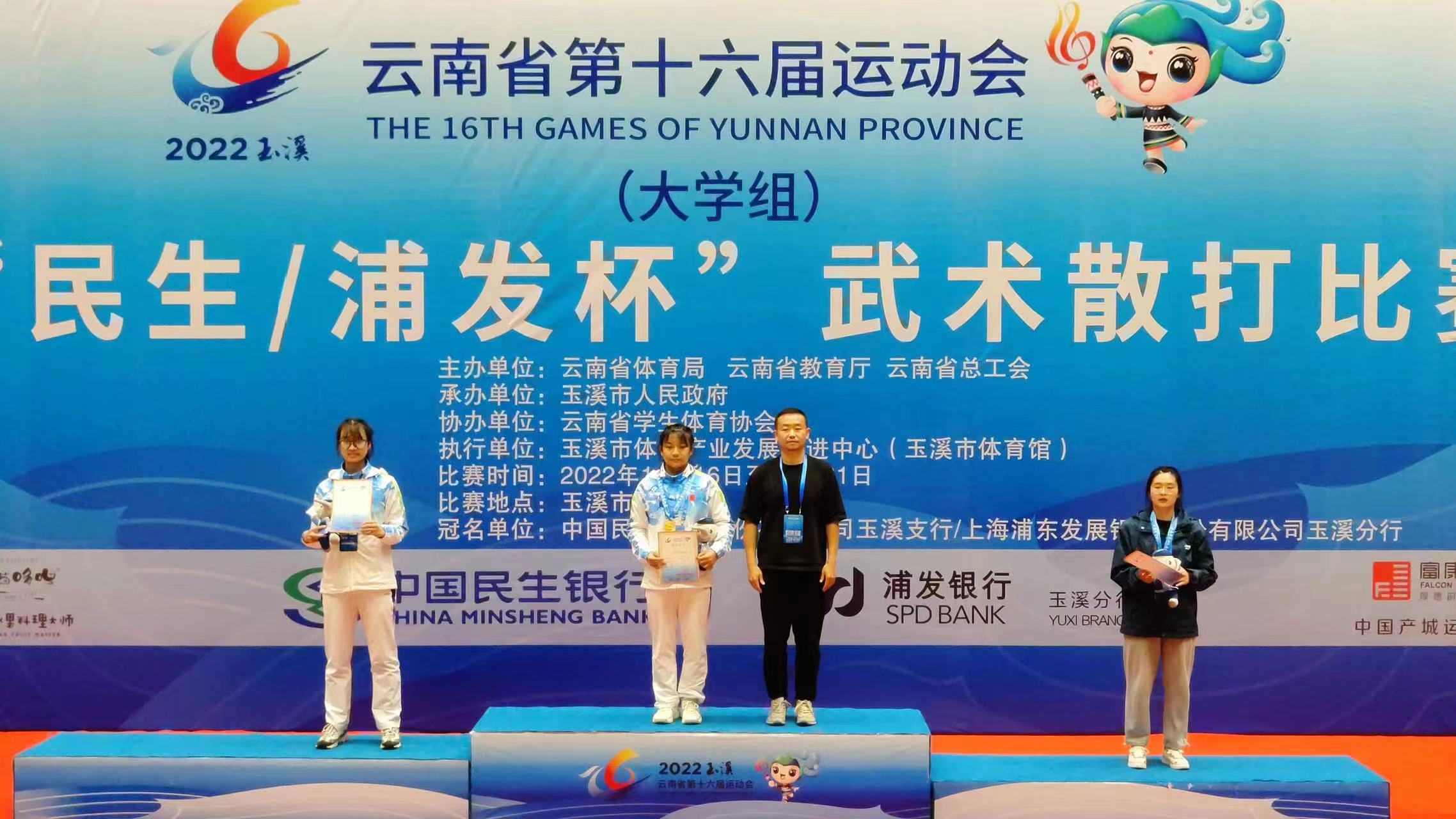 武术散打项目:11月20日,云南省第十六届运动会大学生组散打比赛在玉溪市体育馆顺利结束。组建2个月的william威廉中文官网散打队在在桂源海、杨昊旻两位教练的带领下,经过4天的激烈角逐,最终取得团体总分第三名,单项两金三银三铜的好成绩。其中,白迪沙同学获得60kg级冠军,柯蓉同学获得62kg级冠军。