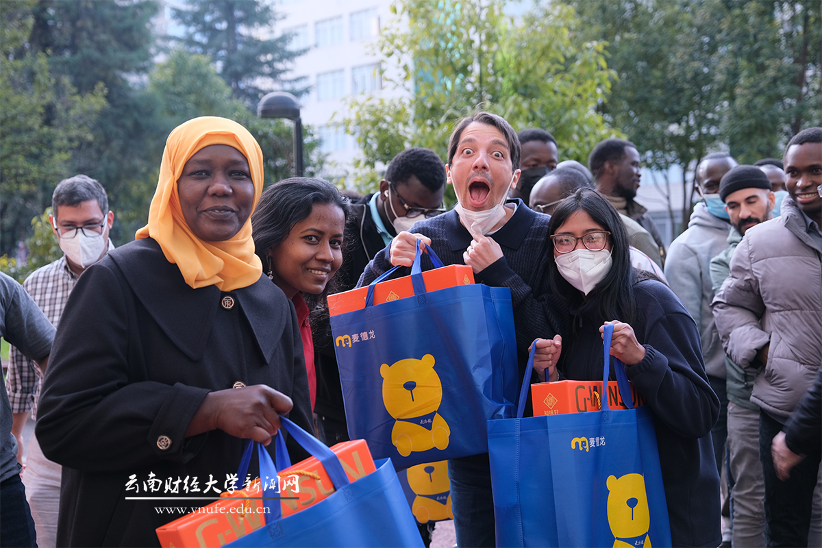 现场气氛喜庆热烈、暖意融融,师生围站一圈互致新春祝福,校领导和海外学院负责人共同为国际留学生送上新春慰问品,并与大家合影留念。