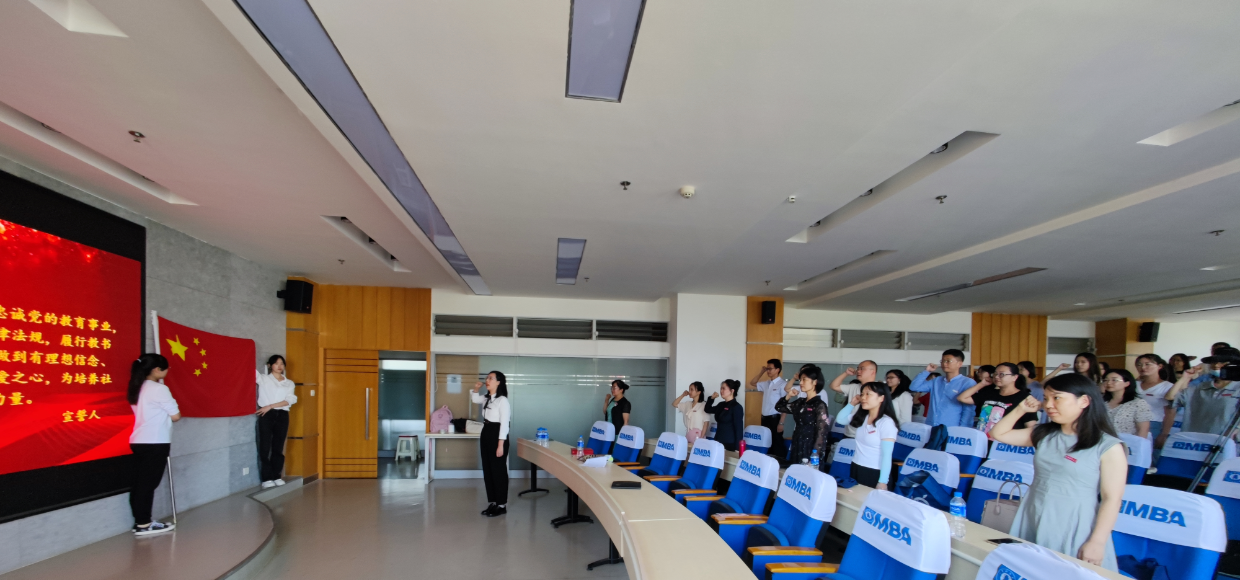 “我志愿成为一名人民教师,忠诚党的教育事业,贯彻党的教育方针,遵守教育法律法规,履行教书育人职责,引领学生健康成长,做到有理想信念、有道德情操、有扎实学识、有仁爱之心,为培养社会主义建设者和接班人贡献全部力量。”面对国旗,由梁牧老师领誓,全体新教师庄严宣誓,共同表达不忘初心、牢记使命,坚定“为党育人,为国育才”的理想信念。新教师入职宣誓环节,旨在激发新教师教书育人的责任感、使命感和荣誉感,努力成为“经师”与“人师”相统一的“大先生”。