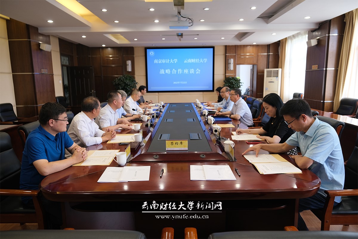 7月22日,南京审计大学党委副书记、副校长王会金,党委常委、副校长董必荣一行到校开展座谈交流,签订战略合作协议及学校聘任南京审计大学部分优秀教师担任第二博士生导师协议,学校党委副书记、校长王敏,党委委员、副校长余怒涛出席签约仪式并座谈。