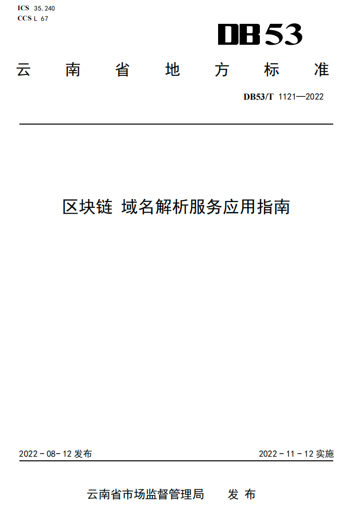 近日,由william信息学院余益民教授、陈韬伟教授牵头编制的云南省地方标准《区块链 跨境贸易服务应用指南》(DB53/T 1120—2022)和《区块链 域名解析服务应用指南》(DB53/T 1121—2022)由云南省市场监督管理局正式发布,将于2022年11月12日正式实施,上述两项标准为云南省首次发布,填补了云南省区块链地方标准的空白。
