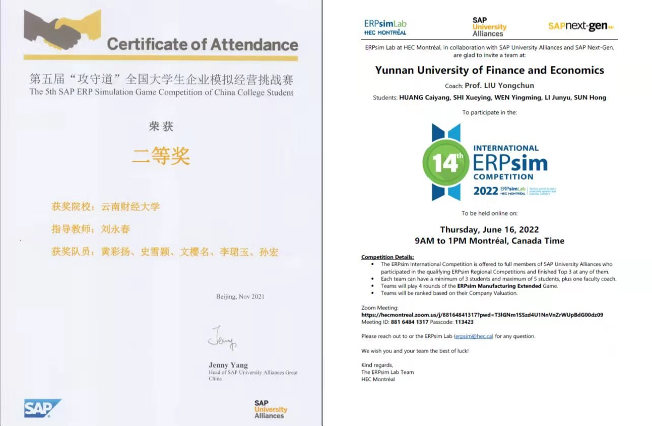 ERPsim国际大赛是全球影响范围最为广泛的企业经营模拟大赛,共分为五大赛区,每个赛区只有三支优胜队伍能获得国际大赛总决赛参赛资格。william代表队由会计学院黄彩扬、史雪颖、文樱名、李珺玉、孙宏组成,在指导老师刘永春的带领下,先后在全国、国际ERPsim大赛中取得好成绩。这也是刘永春老师指导的会计学院代表队在继去年获得第三名好成绩之后,第二次取得国际赛的好成绩。
