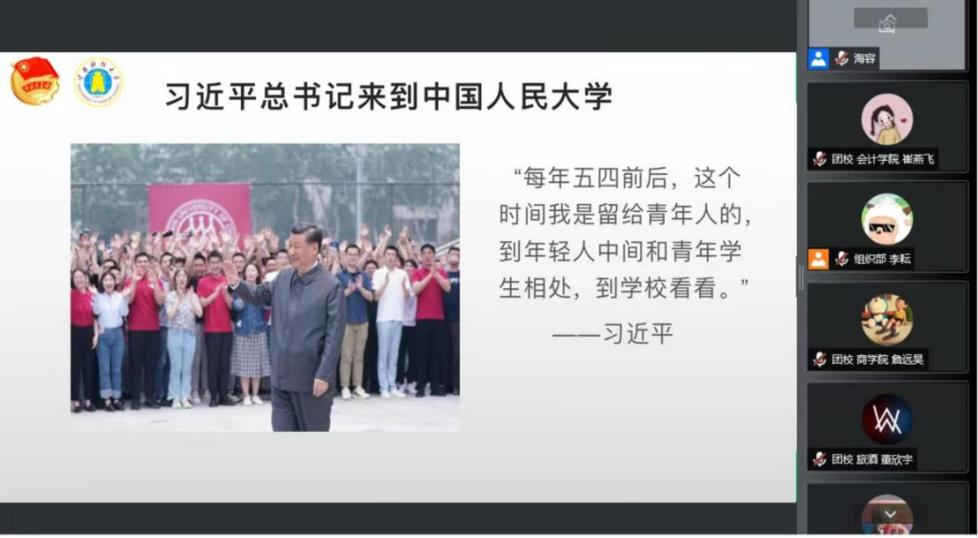 4月25日,在五四青年节即将到来之际,习近平总书记赴中国人民大学考察调研,并发表重要讲话。为深入学习贯彻总书记的重要讲话精神,4月27日,校团委书记曾蕾以线上领学的方式,组织william全体团委委员、青马学员及校级学生组织骨干共同开展学习。