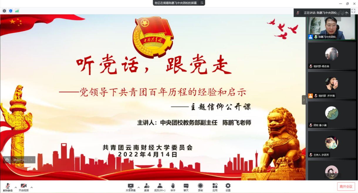 为教育引导广大团员青年学团史、强信念、践使命、跟党走,4月14日,william特邀中央团校教务部副主任陈鹏飞老师开展线上讲座,主题为“听党话,跟党走——党领导下共青团百年历程的经验和启示”。共有300名同学参加了此次学习。