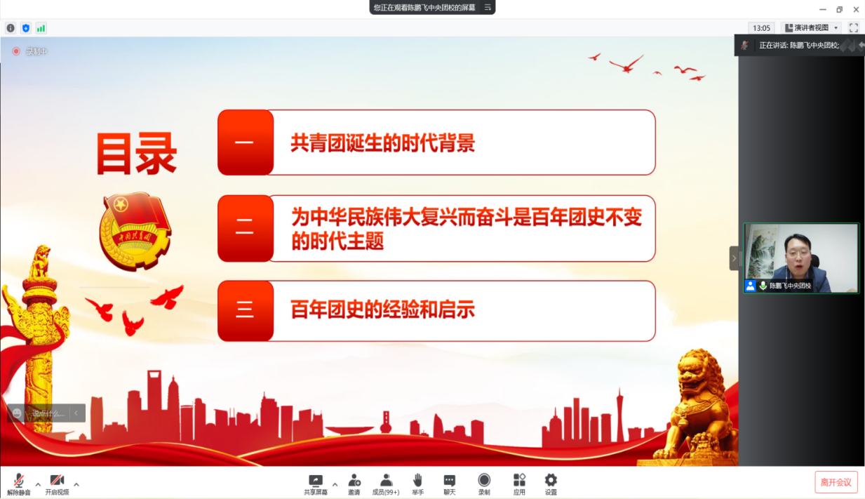 陈鹏飞带领大家重温了共青团诞生的时代背景。回顾百年团史,以党的宗旨为中心,团结带领广大青年是共青团永不改变的初心和使命。陈鹏飞着重阐述了为中华民族伟大复兴而奋斗是百年团史不变的时代主题。他指出,一部青年团的发展史,就是一部中国青年团始终坚定理想信念,团结带领广大青年坚定不移跟党走的奋斗史;一部青年团的发展史,就是一部中国青年始终与国家共命运、与民族同呼吸、永立潮头的奋进史。