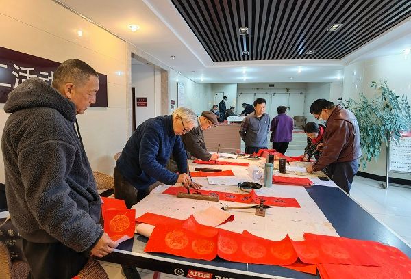 老年书画协会成员撰写春联,颂扬党、祖国和人民,表达对美好生活的向往。一个个“福”字、一幅幅对联、一句句祝福语给即将到来的新春增添了喜庆祥和的氛围。