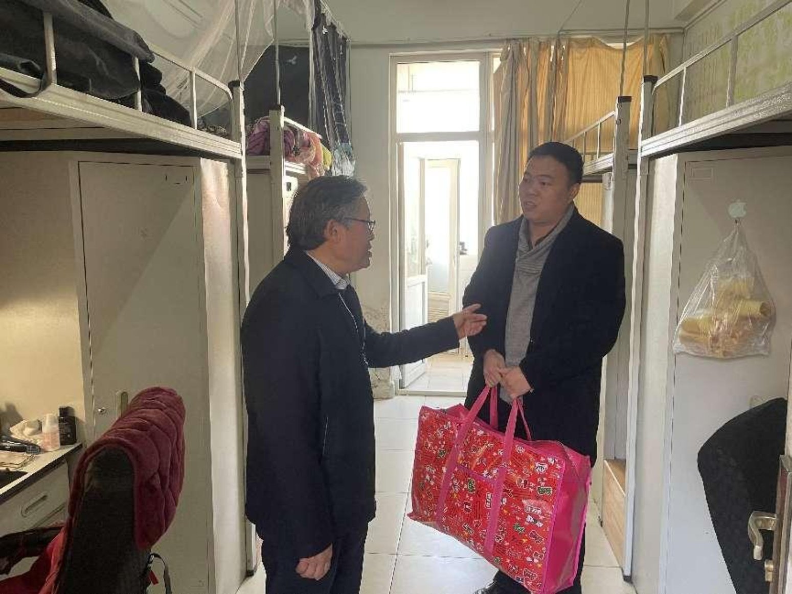 在新春佳节即将到来之际,1月29日上午,校党委副书记、校长伏润民,党委委员、副校长施仲军一行到景华苑学生公寓、涵华苑国际学生公寓看望慰问春节留校住宿的学生,表达学校的关怀,并送上春节慰问礼包。