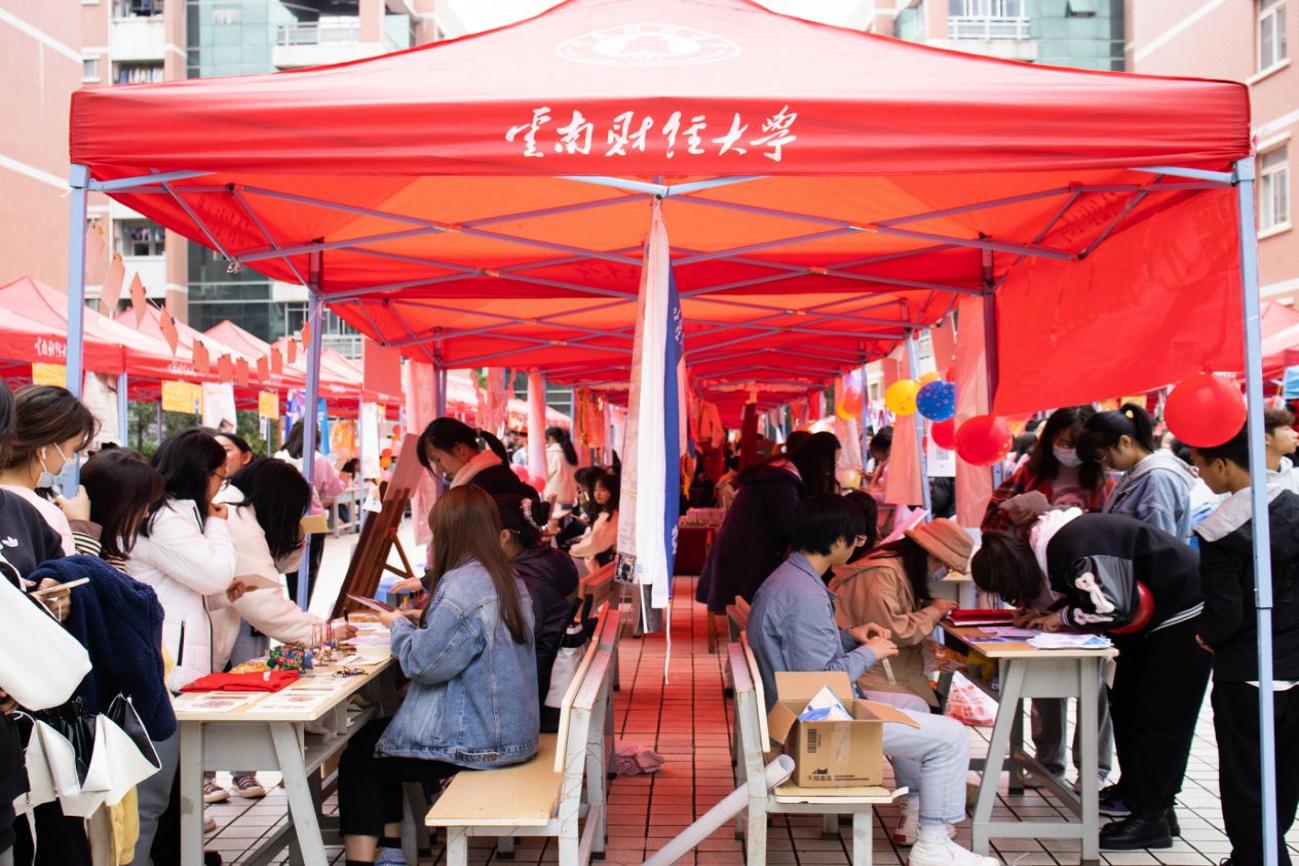 博览会依托“社彩剪影”展示77家社团的特色作品。“‘礼乐’中国传统文化传习社”“雨林风情协会”“民族团结进步社”等具有民族特色社团将中国传统文化的精神内涵通过汉服、扎染、民族工艺品、书法绘画、茶道、传统礼乐展示等形式展示,让同学们感受民族团结一家亲的和谐氛围,也将民族文化、传统文化的元素融入其中。
