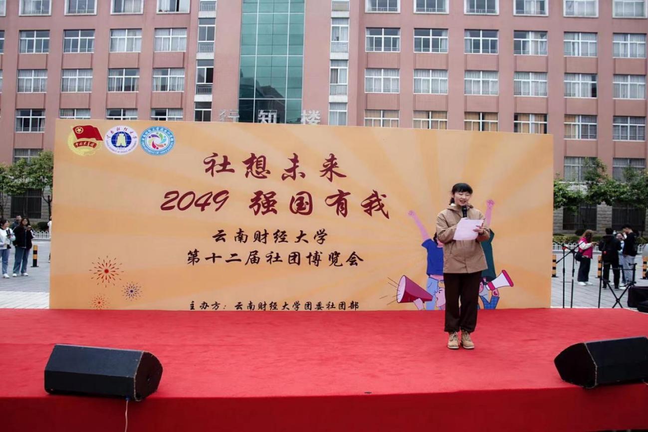 在博览会的“社艺风采”版块中,校团委副书记李昀璟朗读了全体团委老师“给2049社团博览会的一封信”,信中写到“到2049年,我们都已经成为老人,但社团却永远年轻,仍然是20岁出头的年轻人在参与。我们不能忘记同学们参与学生社团的初心,在这里我们能选择兴趣发展技能,也不能忘记身逢盛世才有个人的选择和奋斗。”信的内容与此次博览会主题“社想未来 强国有我”相呼应,倡议每一位云财人不忘初心,勇敢逐梦,发展技能,奔赴未来。