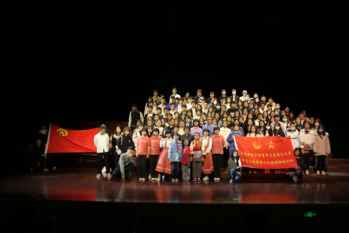 主创人员与我校全体团委委员、学委委员和第十六期团校学员在演出结束后合影